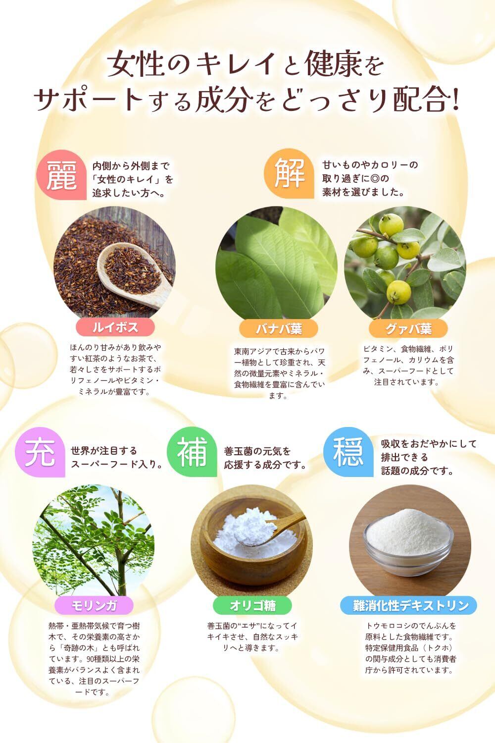 【キレイと健康をサポートする成分をギュッと配合】若々しさをサポートするルイボスをはじめ、世界が注目するスーパーフード「モリンガ」「グァバ葉」、古くからパワー植物として珍重されてきた「バナバ葉」など話題の原料をギュッと配合しています。
