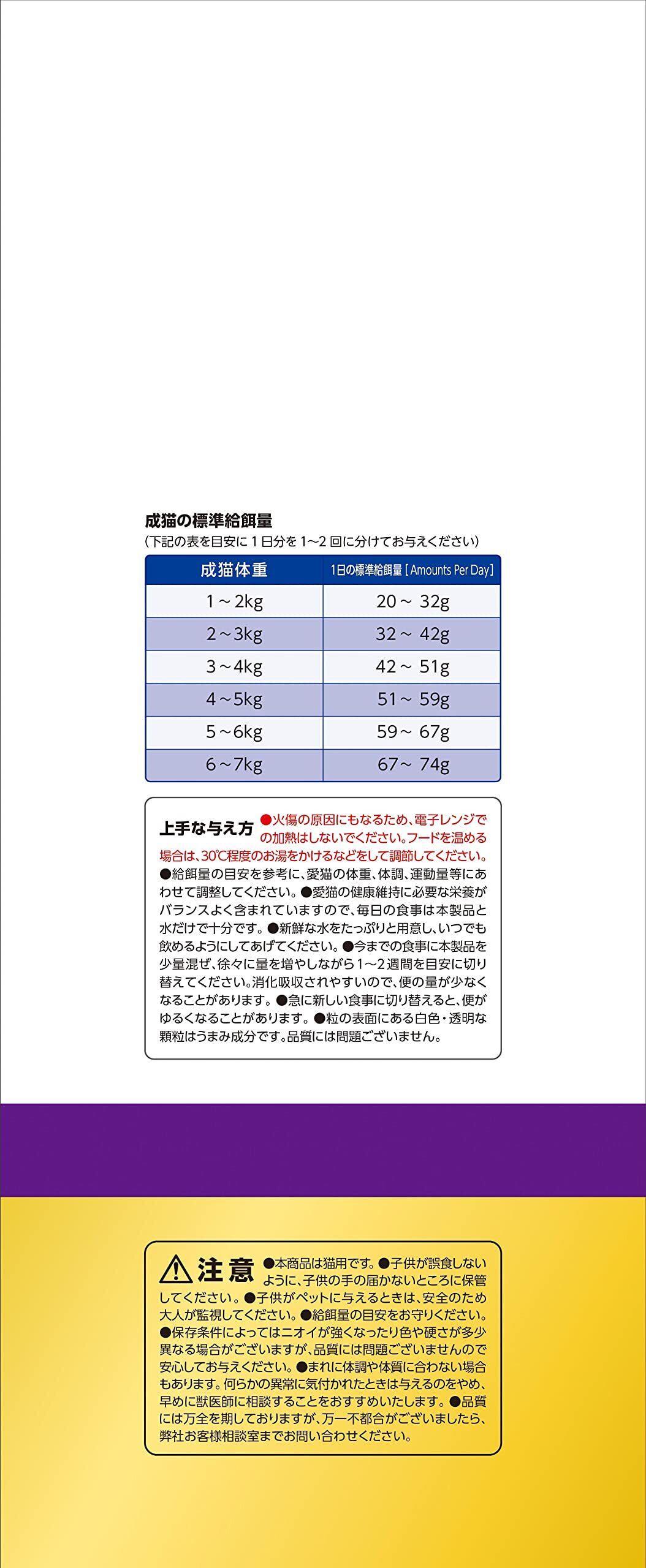 【原材料】 トウモロコシ、グルテンミール、フィッシュミール、小麦粉、乾燥おから、動物性油脂、フィッシュエキス、ローストアマニ、食物繊維、酵母、まぐろ・かつお削りぶしパウダー、乳酸菌、植物性油脂、アガリクス、セサミン、ミネラル類(P、K、Cl、Na、Zn、Cu、Mn、I)、アミノ酸類(シスチン、メチオニン、タウリン)、ビタミン類(コリン、E、ニコチン酸、C、B1、B2、A、B6、葉酸、パントテン酸、K、B12、D3)、調味料 【成分】 たん白質・・・28.5%以上、脂質・・・9.0%以上、粗繊維・・・4.0%以上、灰分・・・9.0%以下、水分・・・10.0%以下 【エネルギー】 320kcal(100gあたり)