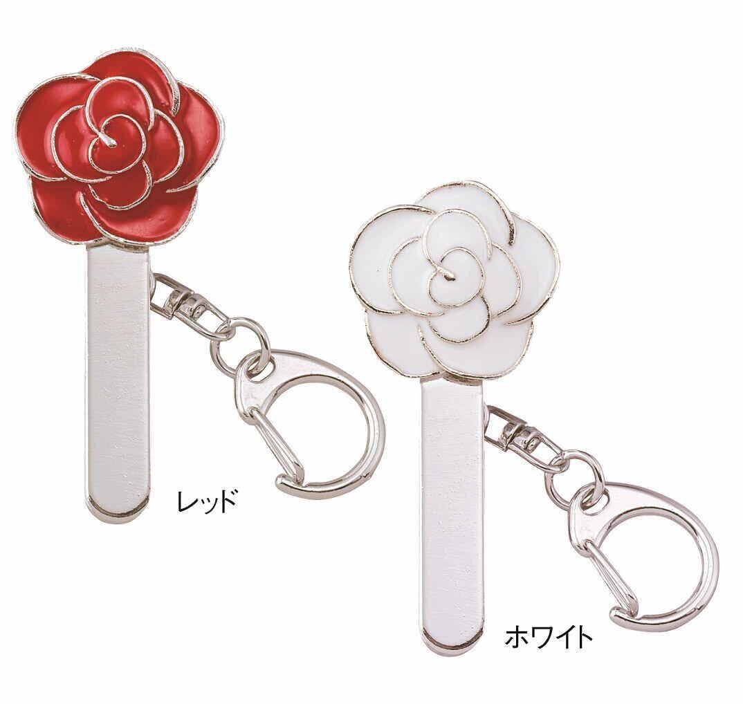 バラをモチーフとしたキークリップ。リングに家や車のカギをつけて、バッグに挟んでおけば、紛失を防げます。