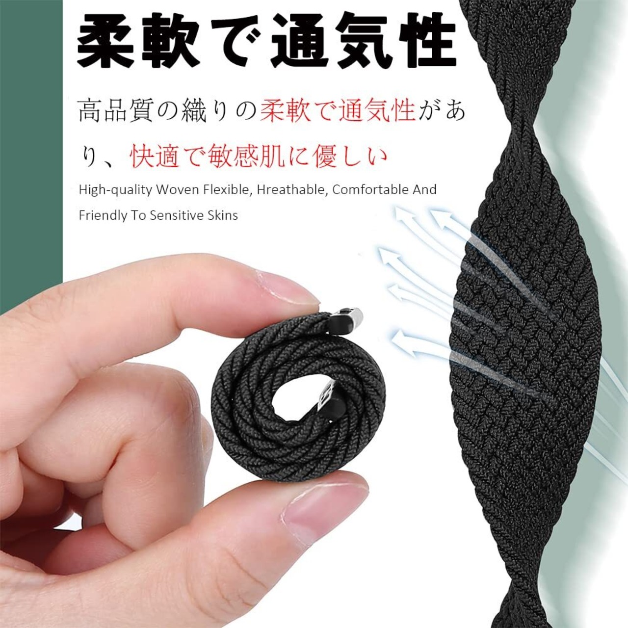 【伸縮素材·優れた通気性】伸縮性のあるナイロン編み込み素材を使用。バンド自身の伸縮性でゴムバンドを手首にはめる様な感じで使用できます。柔軟、耐久性と伸縮性に優れています。柔らかいナイロンメッシュ編みは通気性が優れており、水や汗による変形にも強く、汗ばむ環境でも、サラッとした着け心地で不快感もありませんでした。スポーツやアウトドアでも快適に着用できるおしゃれなバンドです。
