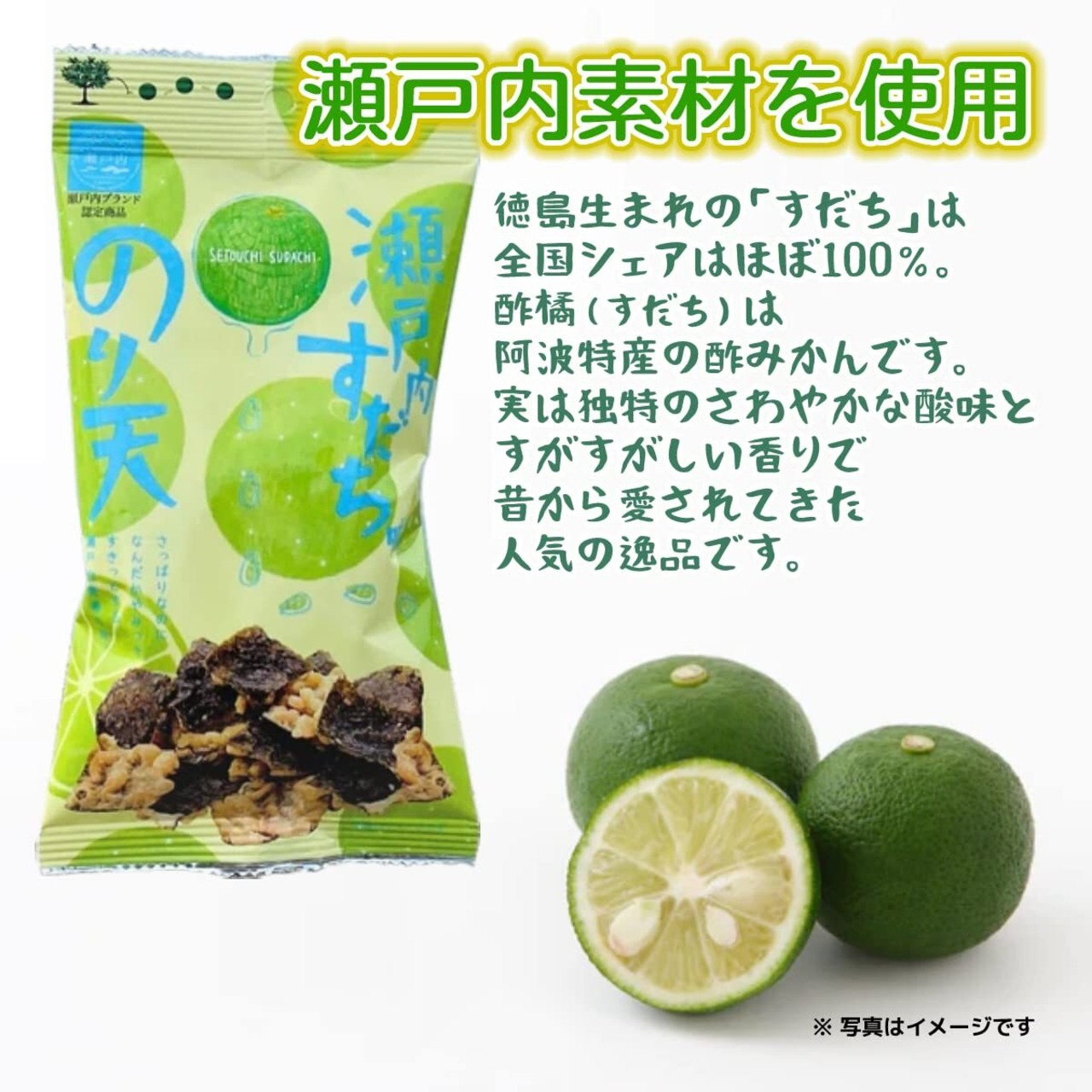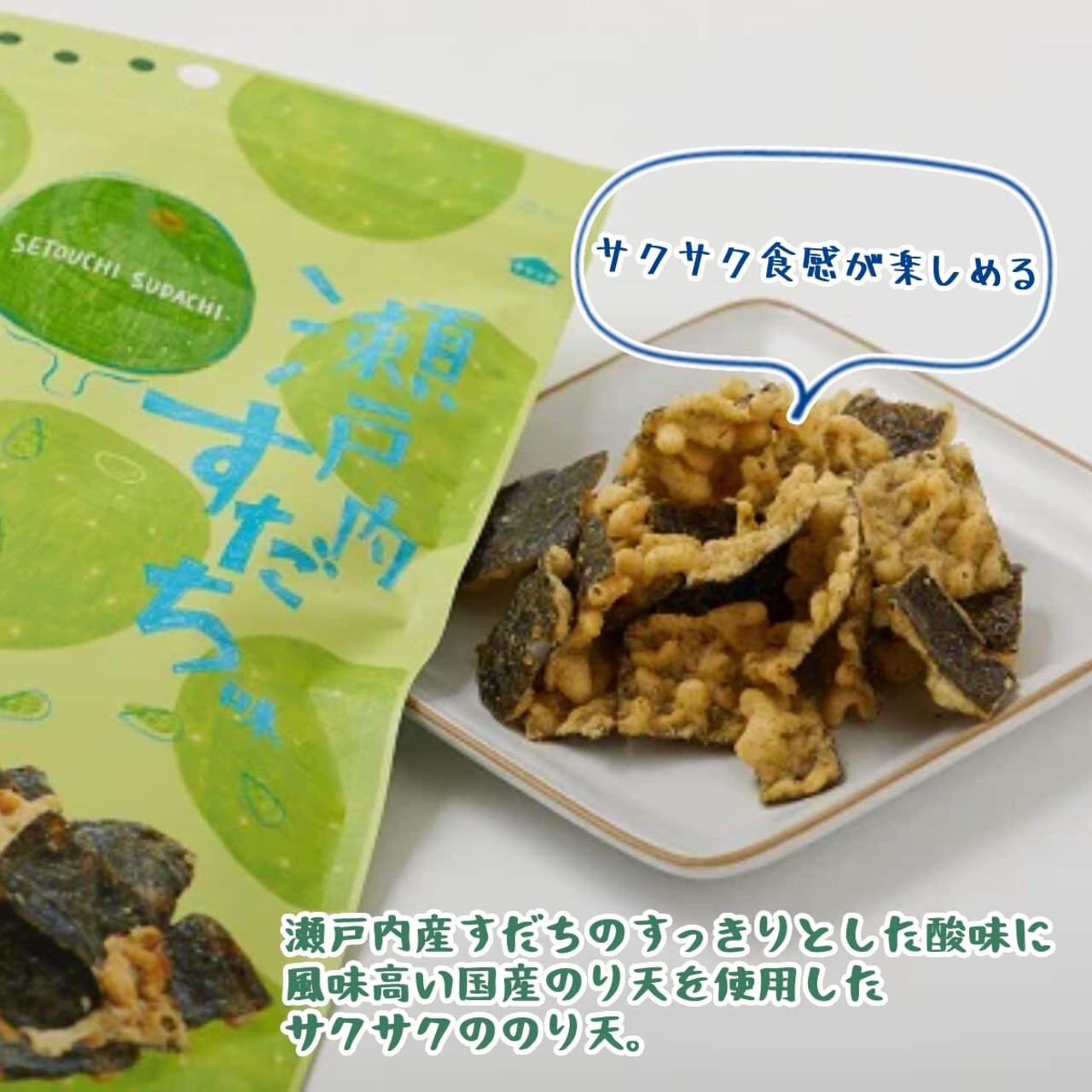 瀬戸内産すだちのすっきりとした酸味に、風味高い国産のり天を 使用したサクサクののり天。食べきりサイズ 27gの小袋タイプ。