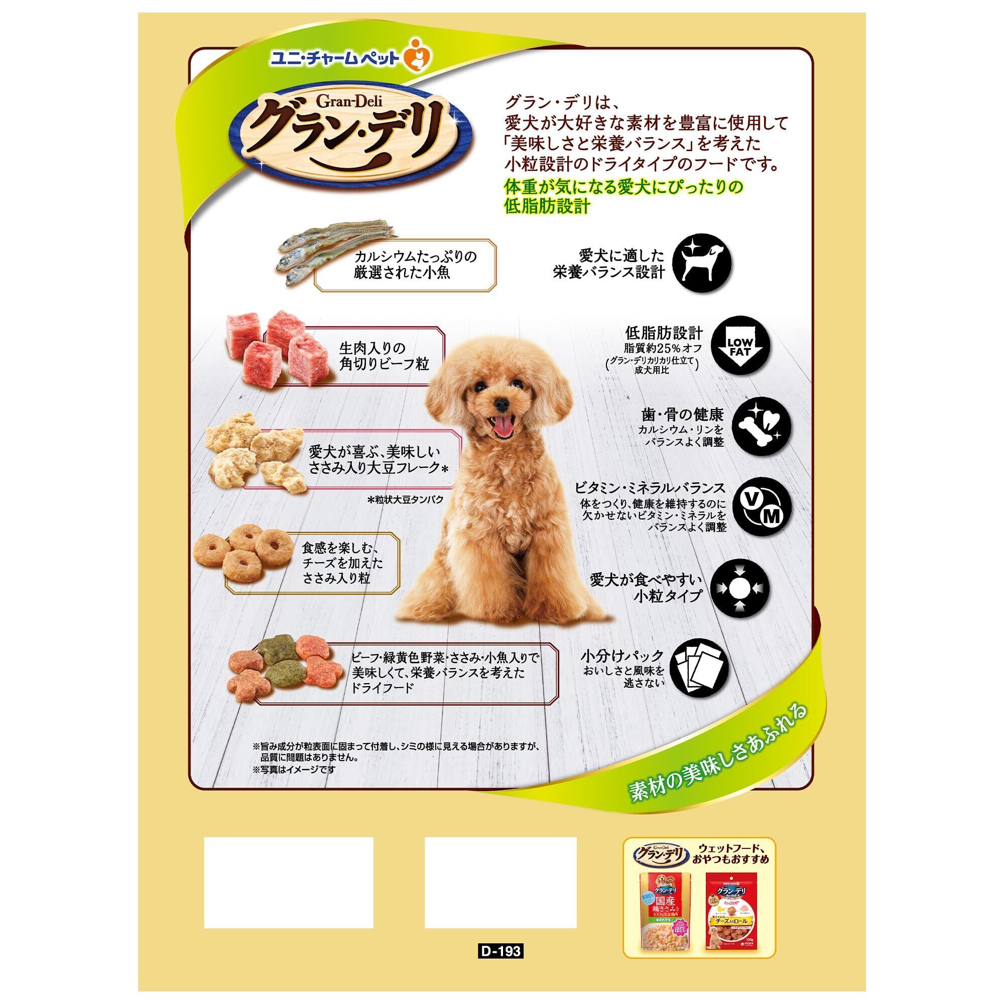 グラン・デリは、愛犬が大好きな素材を豊富に使用して「美味しさと栄養バランス」を考えた小粒設計のドライタイプのフードです。体重が気になる愛犬にぴったりの低脂肪設計