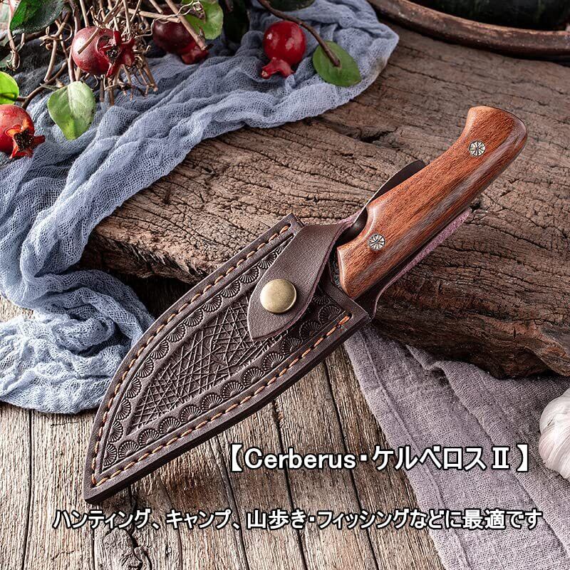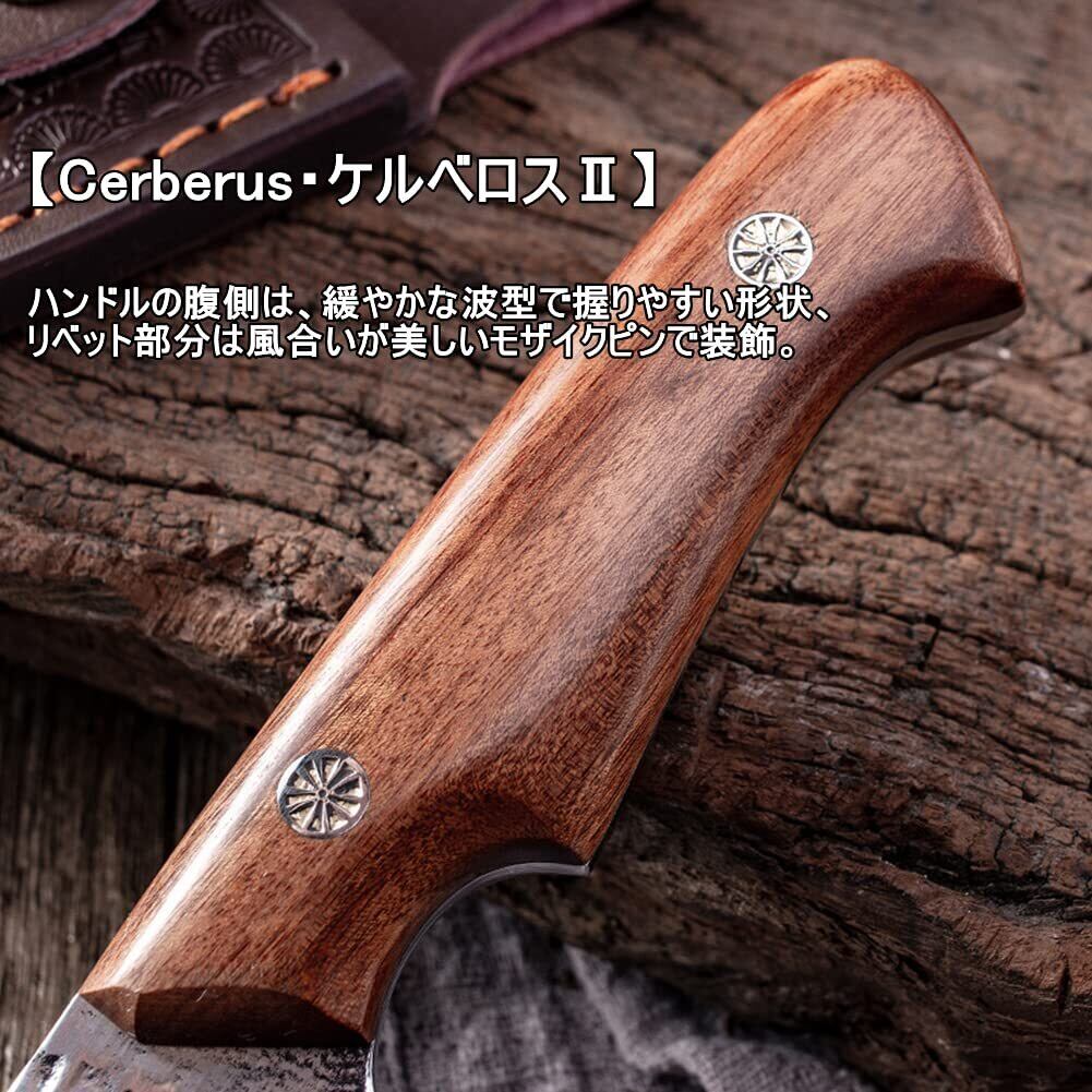【Cerberus・ケルベロスⅡ】 ▼ 仕様 / スペック ▼ ■全長:約220mm ■刃渡り:約113mm ■刃材:33層ダマスカス鋼 ■芯材:VG-10号 ■硬度:62HRC ■柄材:天然木 ■刃厚:2.5mm ■刃幅:35mm ■柄丈:約103mm ■重量:138g ■鞘重量:約36g ■専用鞘:革製