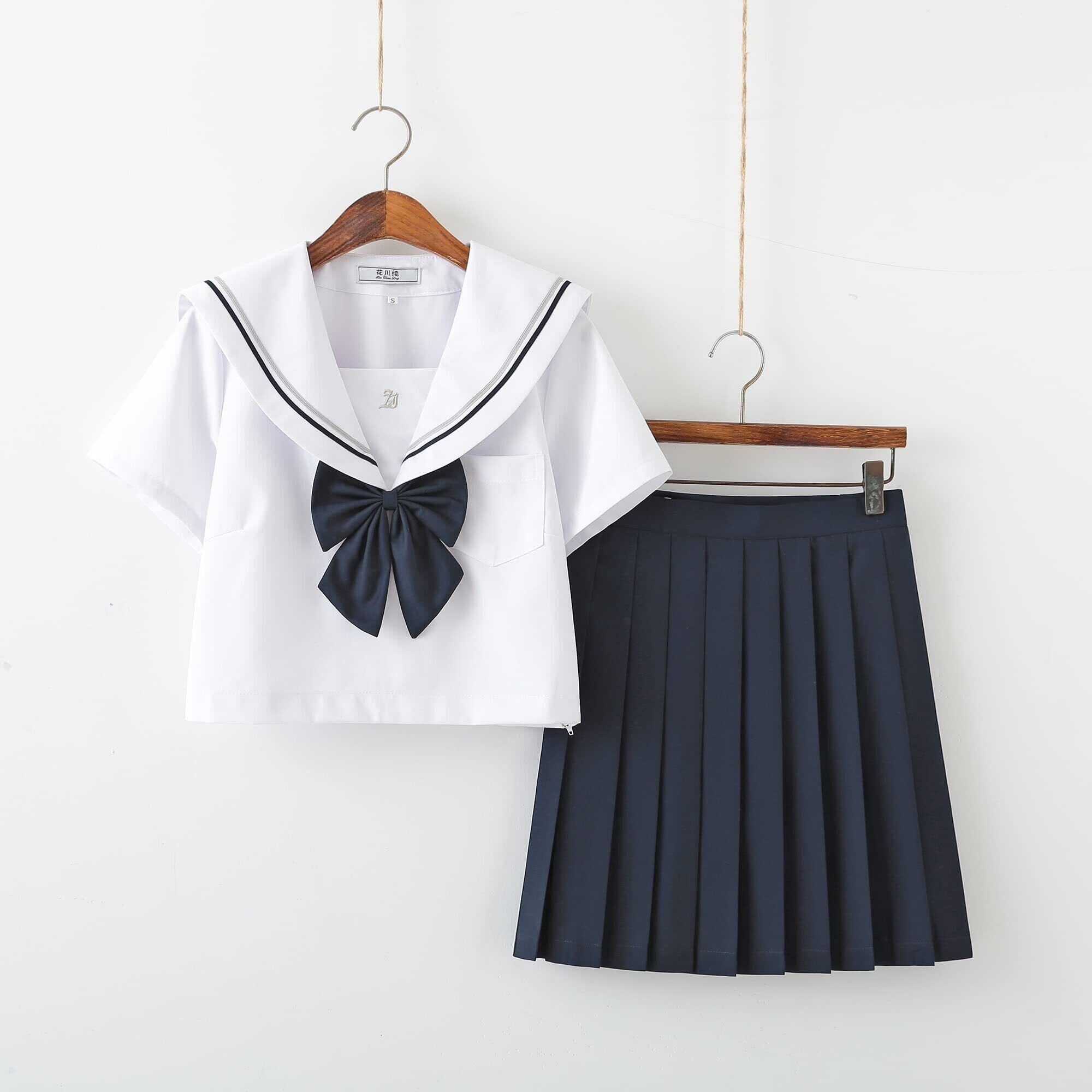 [DERAYEE] セーラー服 コスプレ 女子高生 3点セット 制服スカート 学生服 仮装 JK スカート ストッキング 白 紺い 学園祭 衣装 蝶結び かわいい
