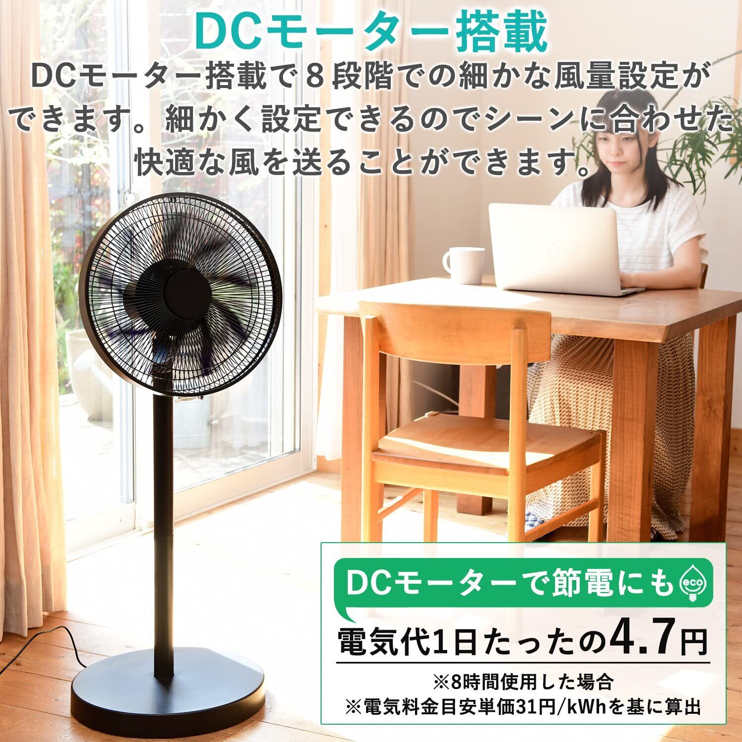 【DCモーター搭載】DCモーターで羽を回すことで、ACモーターよりも羽根の回転を幅広く設定できるので、小さな風を効率よく起こすことが可能です。消費電力も少なくて済み、節電にもつながります。また風量は8段階と細かく設定できるのでシーンに合わせて快適な風を送ることができます。風量調節の最弱は就寝時に最適な静音モードで、運転音が大変静かなので寝ている間も気になりません。