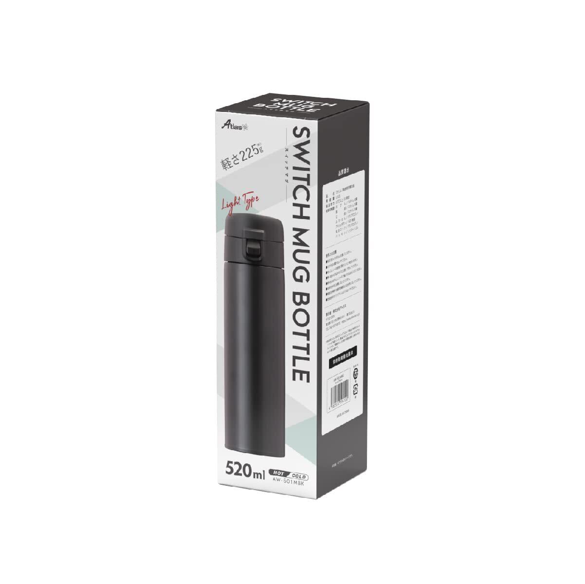 アトラス 水筒 520ml 保冷 保温 軽量 真空断熱 ダブルステンレス ワンタッチマグボトル スイッチマグ マットブラック 白湯 AW-501MBK