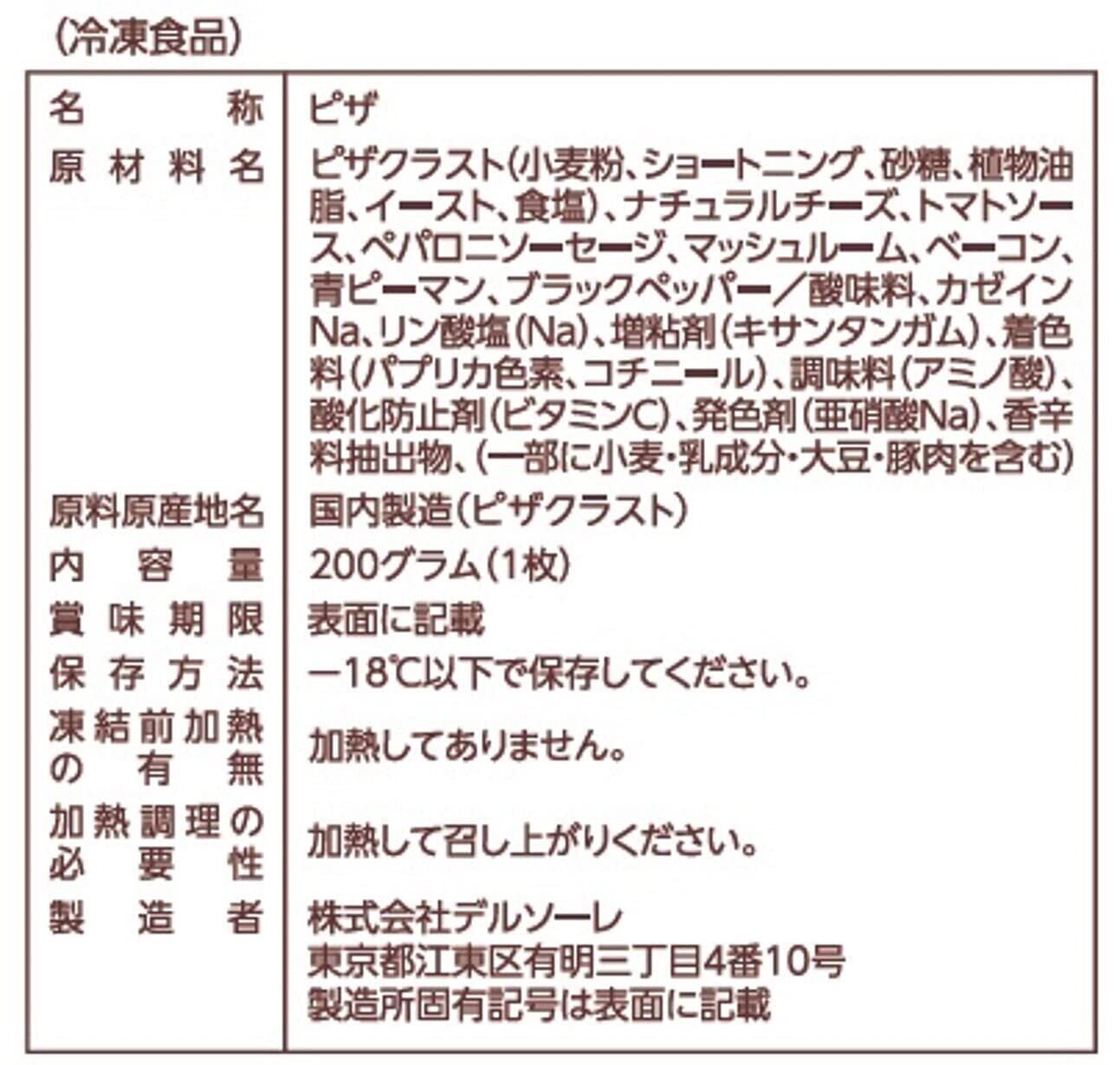 ピザクラスト(小麦粉、ショートニング、砂糖、植物油脂、イースト、食塩)、ナチュラルチーズ、トマトソース、ペパロニソーセージ、マッシュルーム、ベーコン、青ピーマン、ブラックペッパー/酸味料、カゼインNa、リン酸塩(Na)、増粘剤(キサンタンガム)、着色料(パプリカ色素、コチニール)、調味料(アミノ酸)、酸化防止剤(ビタミンC)、発色剤(亜硝酸Na)、香辛料抽出物、(一部に小麦・乳成分・大豆・豚肉を含む)