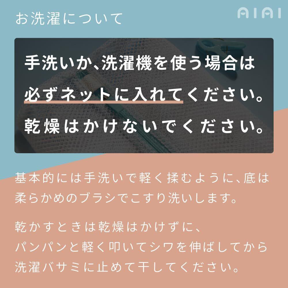 【お洗濯の方法】基本的には手洗いで軽く揉むように、底は柔らかめのブラシでこすり洗いします。洗濯機を使う場合は必ずネットに入れ、乾燥はかけないでください。パンパンと軽く叩いてシワを伸ばしてから洗濯バサミに止めて干してください。