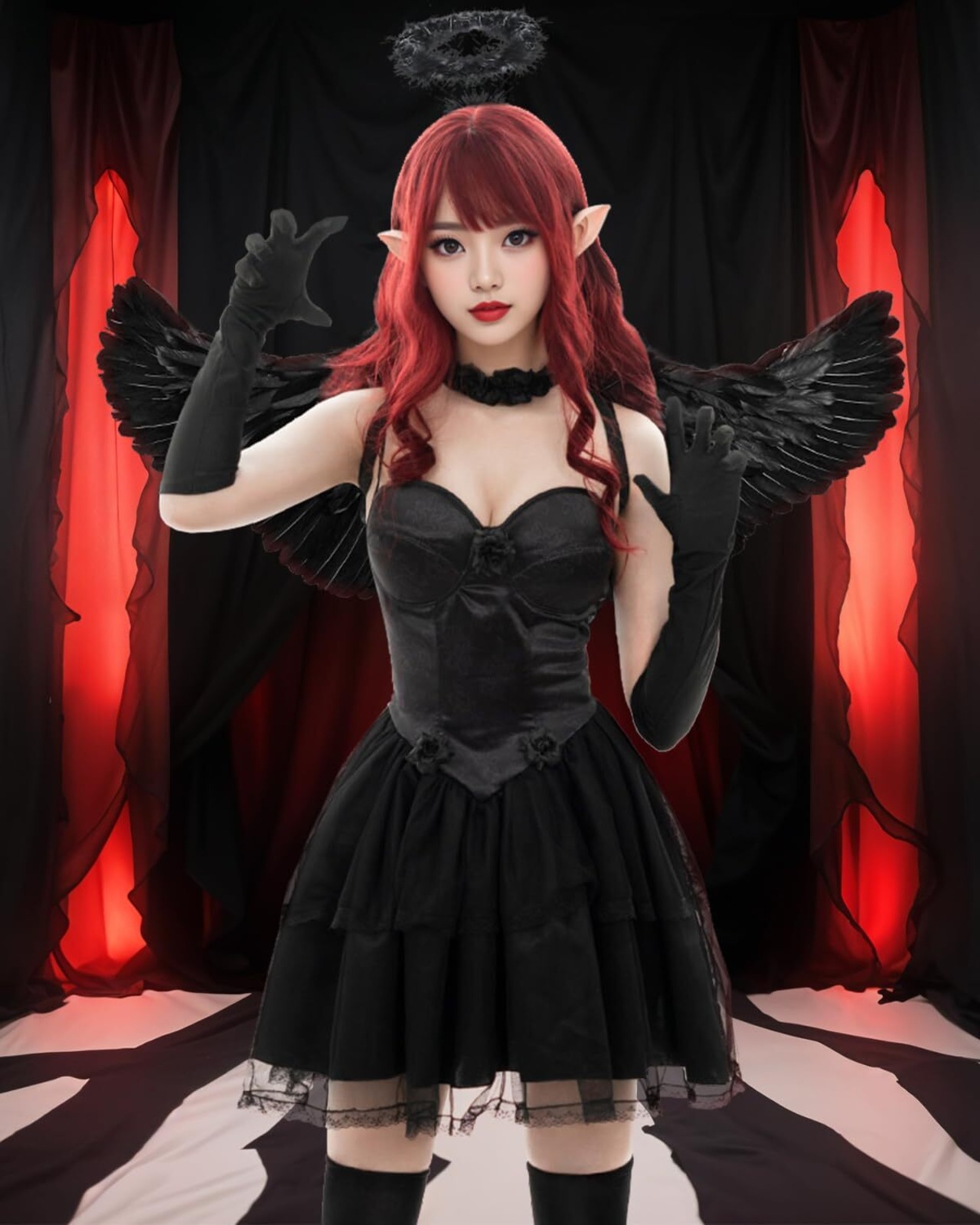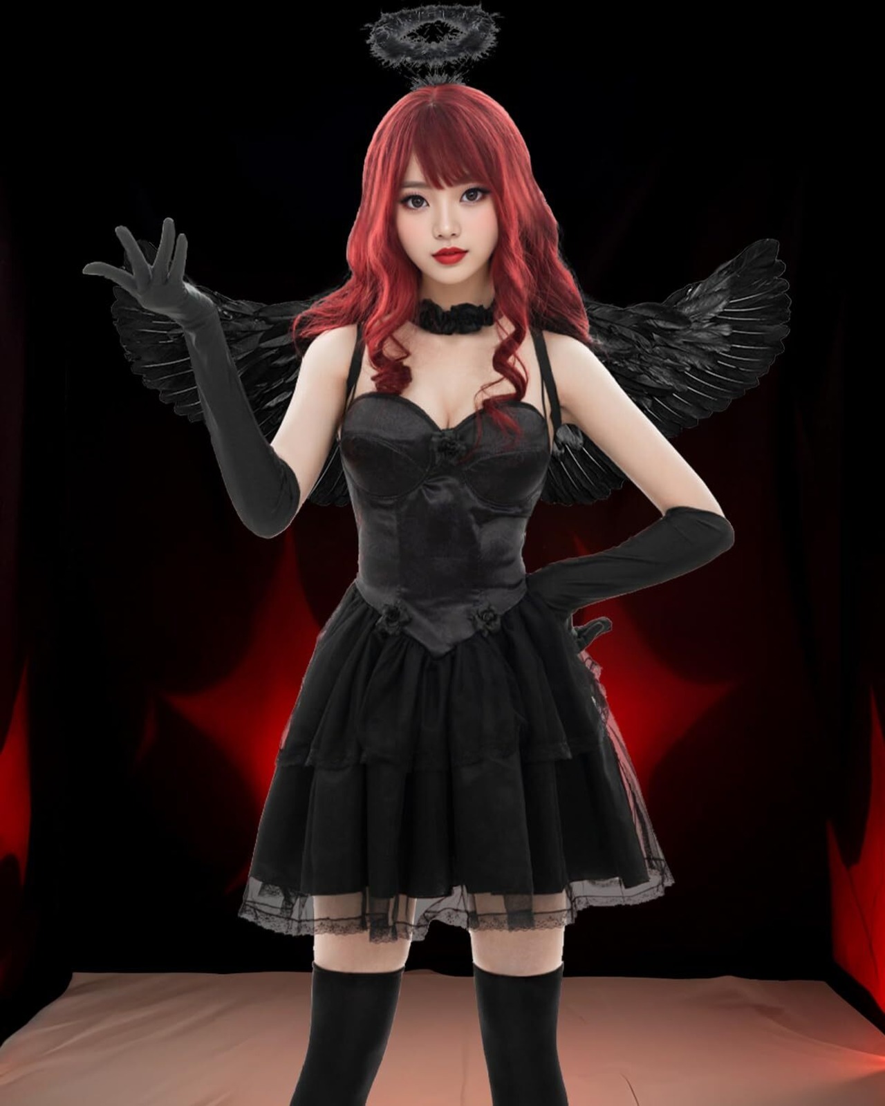 悪魔 コスプレ デザイン:ワンピースの上着はチューブトップスタイルで、とてもセクシーに着ています。胸の前と腰の前にそれぞれ布芸の花があって、とてもかわいいくて、色の簡単なスカートをも譲って、更に美しいです。柔らかいプレミアム素材の羽で作られ、細部まで丁寧に作られております。特に素材の質感が高く完璧なコスプレが可能です。背負うタイプですので、装着、着脱簡単、軽いのでずっと装着していても疲れません。後ろ姿がとても美しい翼です。スカートは何重にも並べられていて、最外層は薄手の糸で、裾はレースの縁になっていて、軽くて汗を吸って快適に着ることができます。
