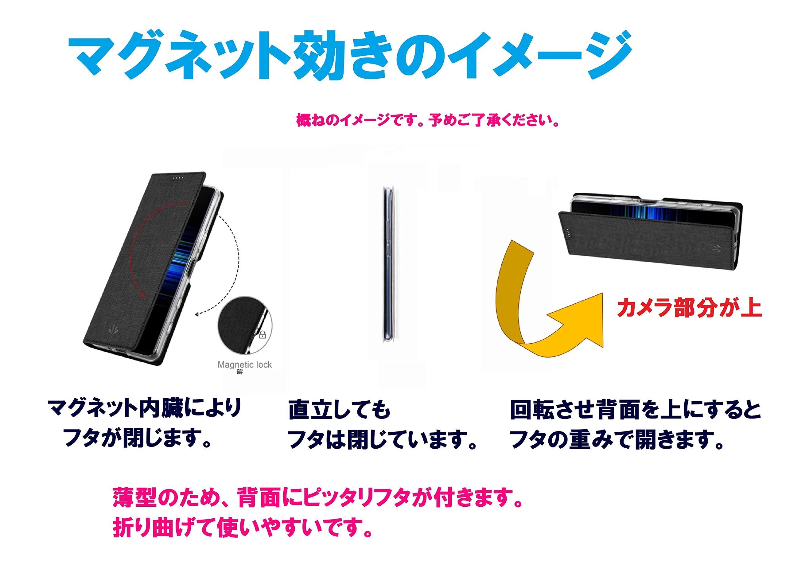 マグネットの効きは弱めです。ケースを傾けるとフタの重みで開く程度の磁力です。(機種本体に貼られた保護ガラス/フィルムや、カード収納の有無によっても異なります。説明画像はカード収納なしのイメージです。