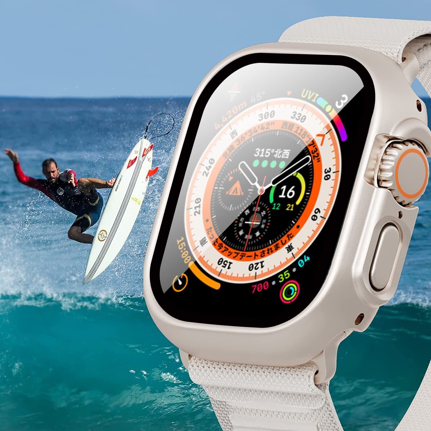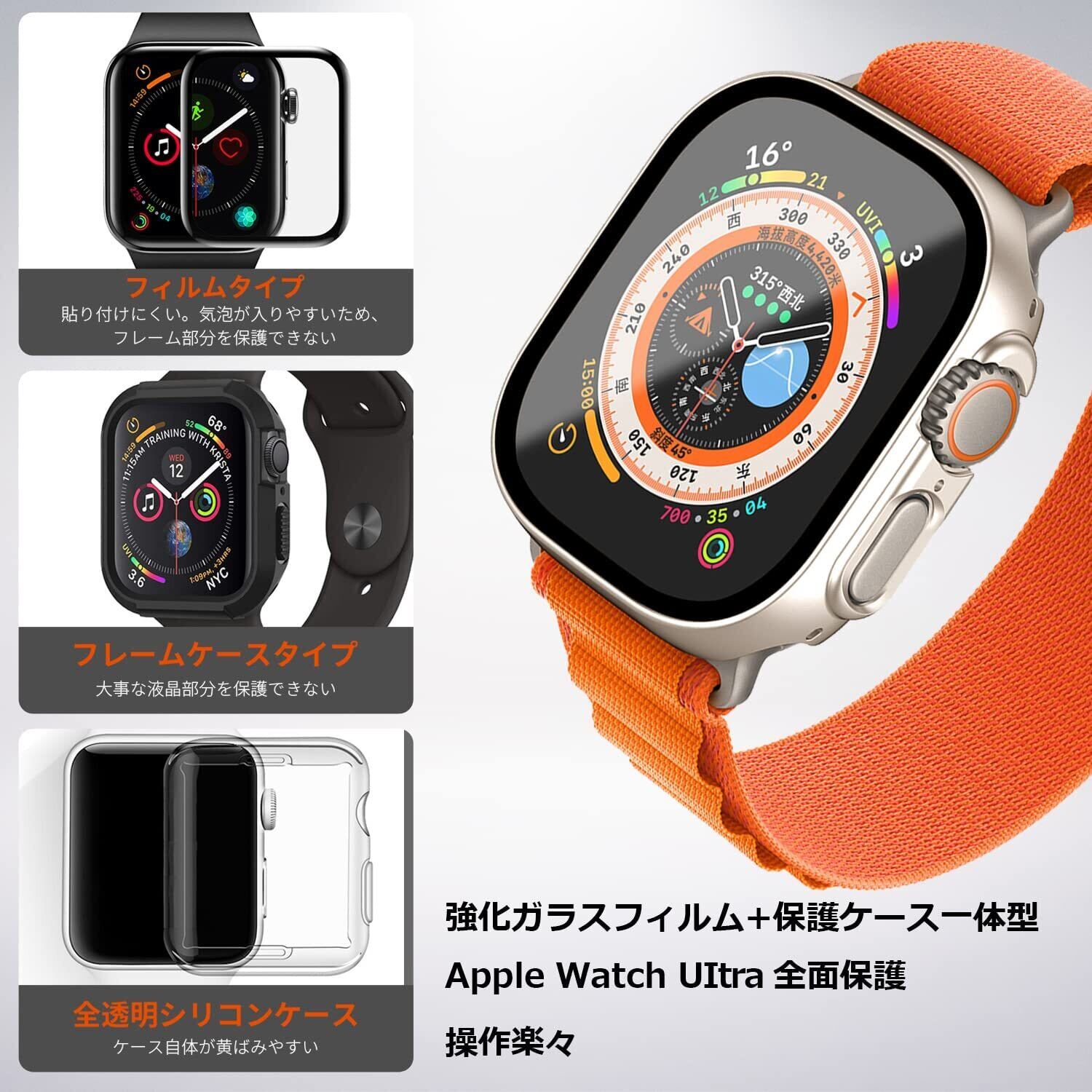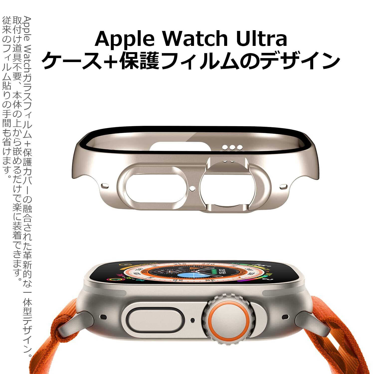 「Apple Watch Ultra/Ultra2 ガラスフィルム+保護カバー一体型」機能性とデザインを兼ね備えて、優れたApple Watch ultra/Ultra2 ケースです。Apple Watch ultra/Ultra2 に合わせて丁寧に作られたフレームなので、違和感なく本体にジャストフィット!日常で起きる損傷リスクを高強度なフィルム層が防ぎ、液晶をキズから保護します。