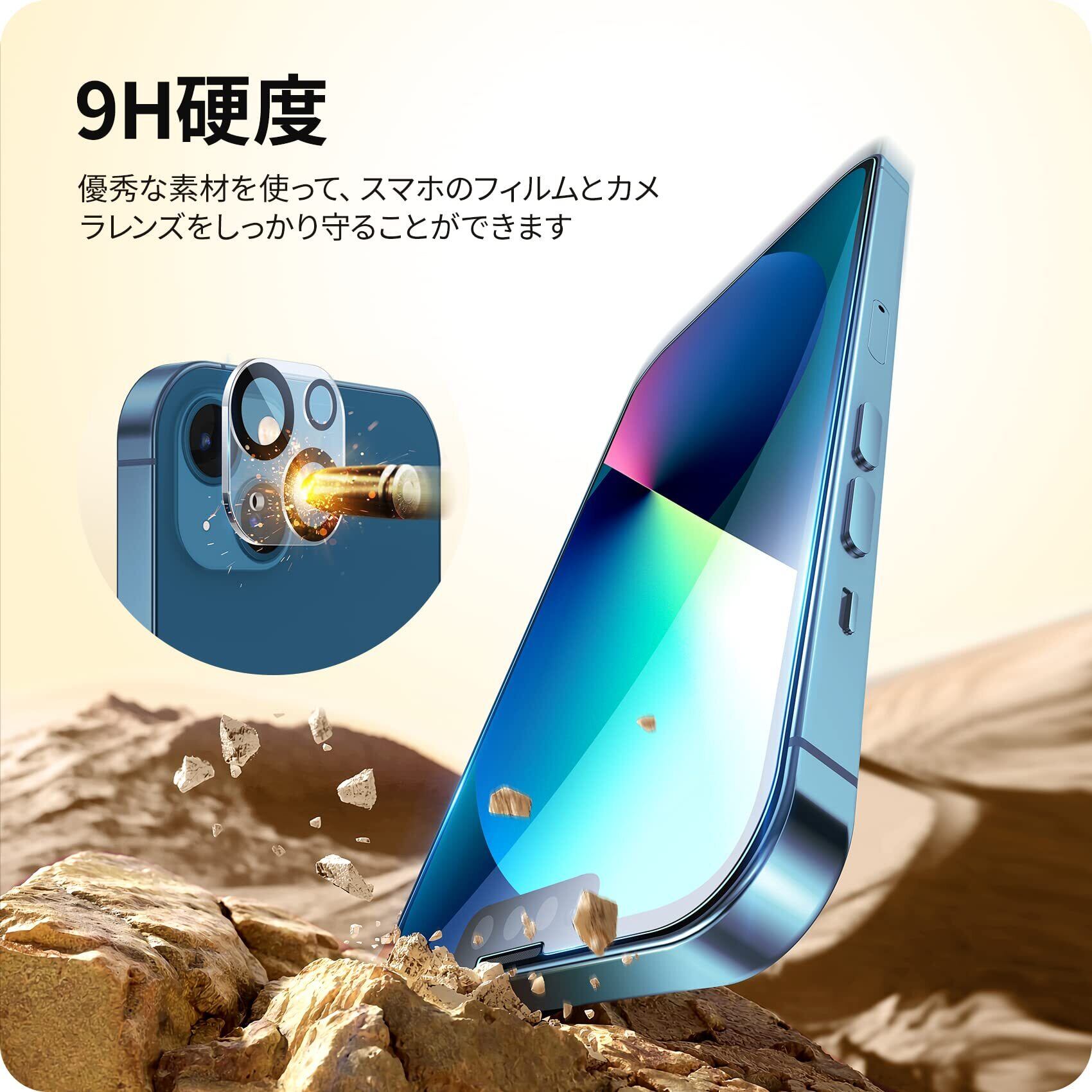 【9H硬度】 9H硬度ガラスを採用し、ハードコーティング技術によりナイフや鍵など鋭利なものと接触しても傷が付きにくく、iPhoneの液晶画面とカメラレンズをしっかり保護します。また、飛散防止加工により、万が 一破損しても破片が飛び散らない設計になっております。