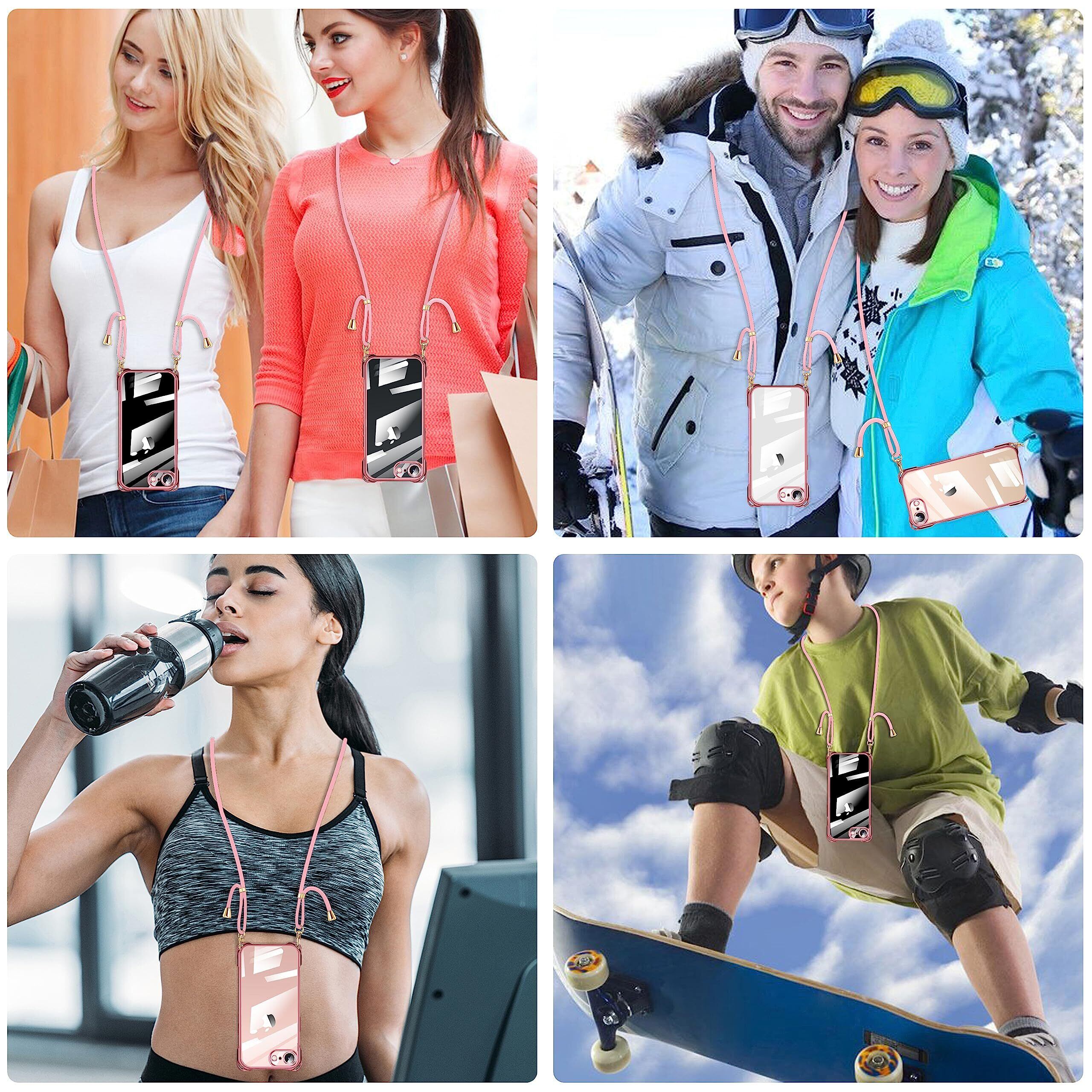 iPhone SE 第3/2世代 7 8 用 ケース クリア ショルダー iphone 7 8 用 スマホケース アイフォン7 8 se2 se3 カバー 肩掛け 斜めかけ 縄掛けケース 透明 TPU 薄型 軽量 耐衝撃 紐付き 斜めがけ 織りストラップ付き ネックストラップ ショルダーケース 縦/横 2WAY 長さ調整可能 取り外し可能 落下防止 紛失防止 ワイヤレス充電対応 (ローズゴールド)