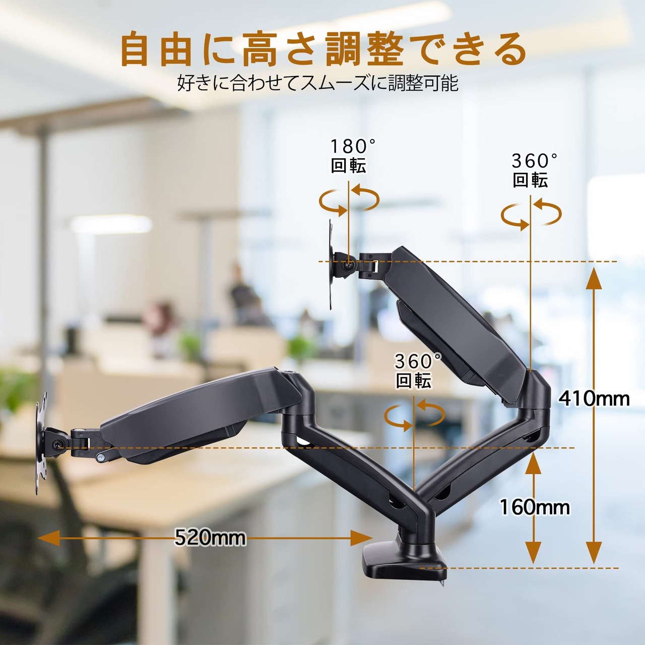 【多角度自由調整、様々なニーズに対応デュアルモニターアーム】このモニタースタンドは非常に高い柔軟性を提供します。画面は360°回転、前後90°傾斜、上下最大315mm、左右180°移動が可能で、横向きから縦向きへの切り替えも自由に行えます。この全方位調整機能により、個人の習慣や特定のタスクに合わせて最も快適な視点を見つけることができ、作業効率を向上させます。