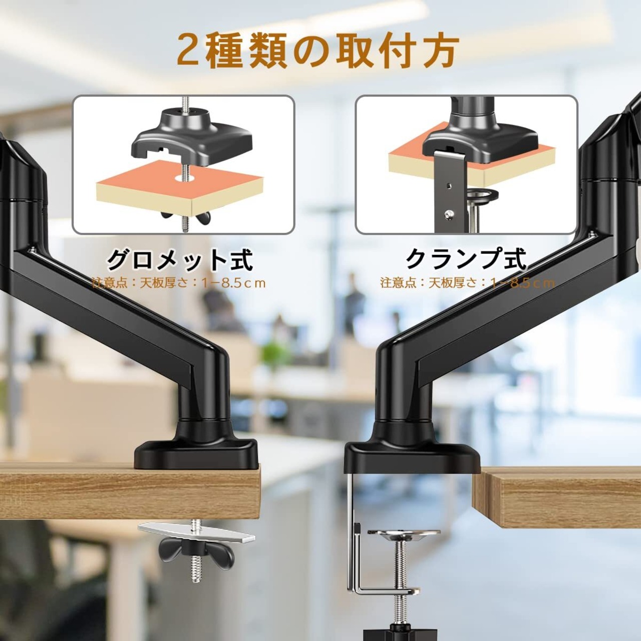 【柔軟な取り付け、幅広い用途なモニターアーム 2画面】異なるデスクトップレイアウトに対応するために、グロメット式(穿孔式)とクランプ式(挟み込み式)の2つの簡単な取り付け方法を提供しています。組立のすべて部品は付属しています、実際の状況に応じて最も適切な方法を選択でき、付属の日本語説明書が各ステップを詳細に案内しますので、インストールは非常に簡単です。どの取り付け方でも、机にしっかり固定するので、液晶ディスプレイの転倒を防ぎ、耐震にも効果があります。