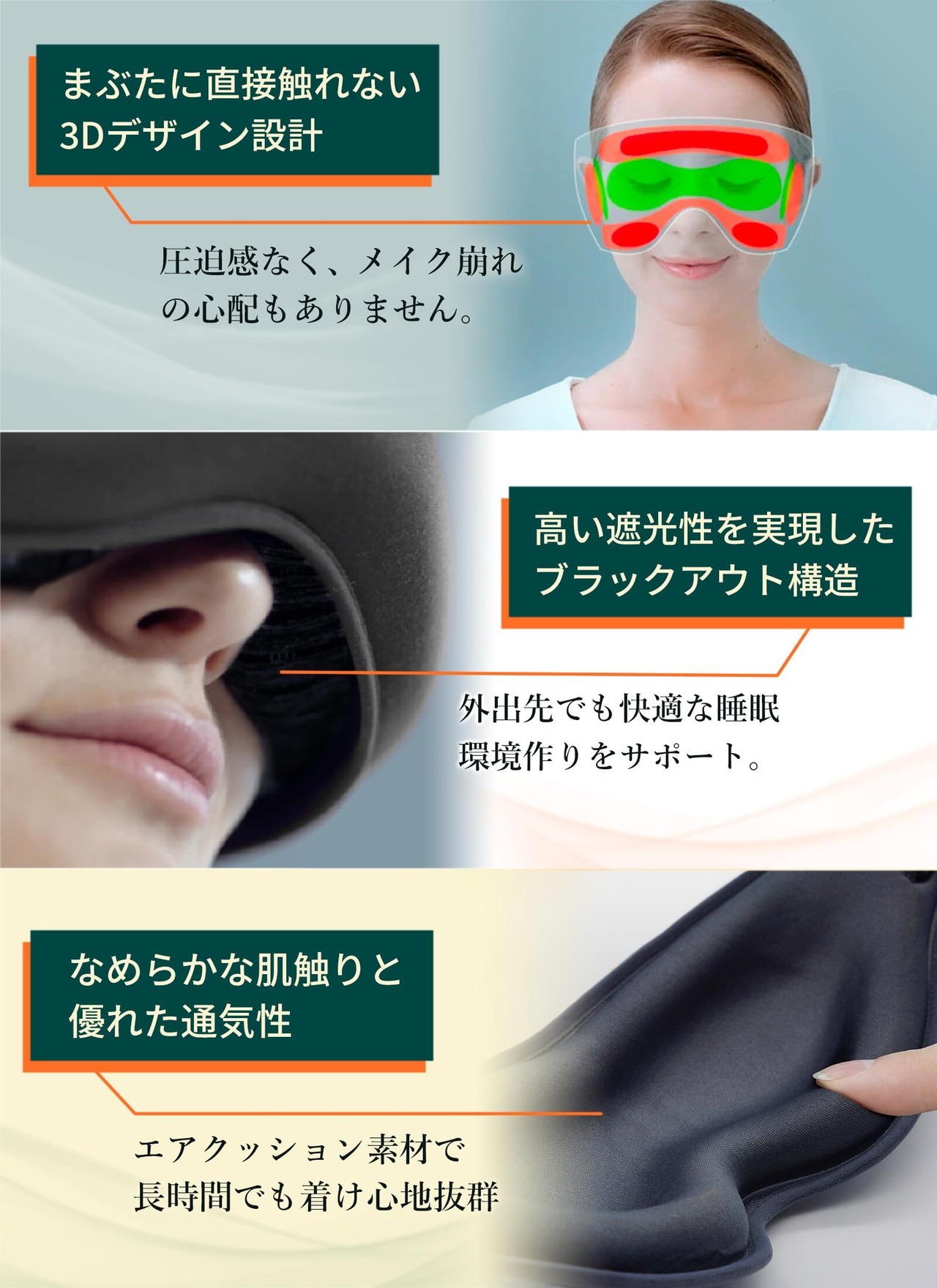 【3Dホール構造・柔らかい肌当たり】目の周りがくぼみ形状になっており、アイマスクの内側がまぶたに直接触れません。装着時の圧迫感がなく、まつエクやマスカラなどのアイメイクをしていても崩さずに使えます。アイマスクの内側はぷっくりとしたエアクッションなので、長時間付けていても痛くなりにくい仕様です。また、通気性にこだわったシルクのようななめらかな肌触りです。