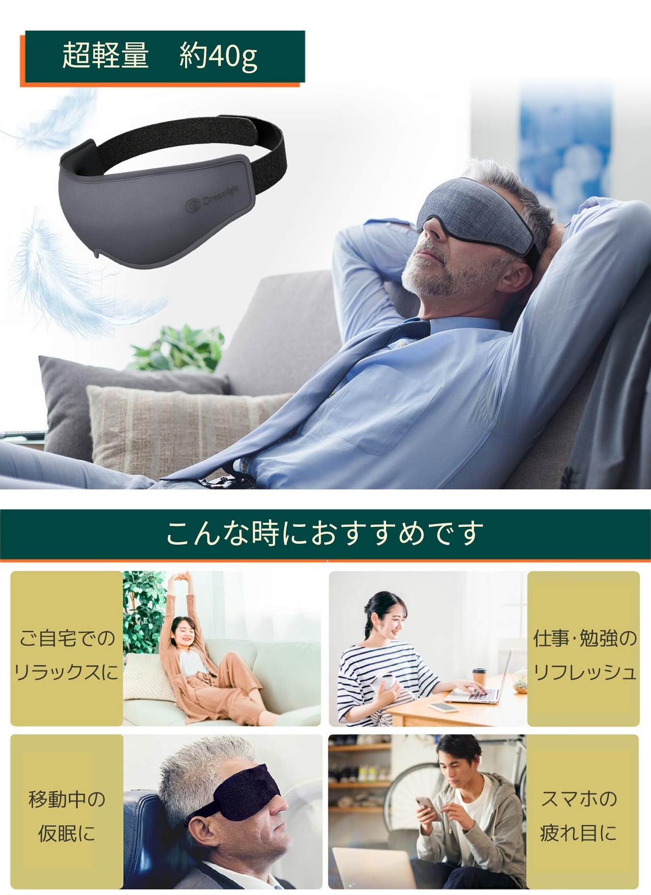 【商品仕様】立体構造により高い遮光性があり、オフィスや外出先などでの睡眠環境作りをサポートします。重量はわずか40g。持ち運びに便利なトラベルケース付きです。