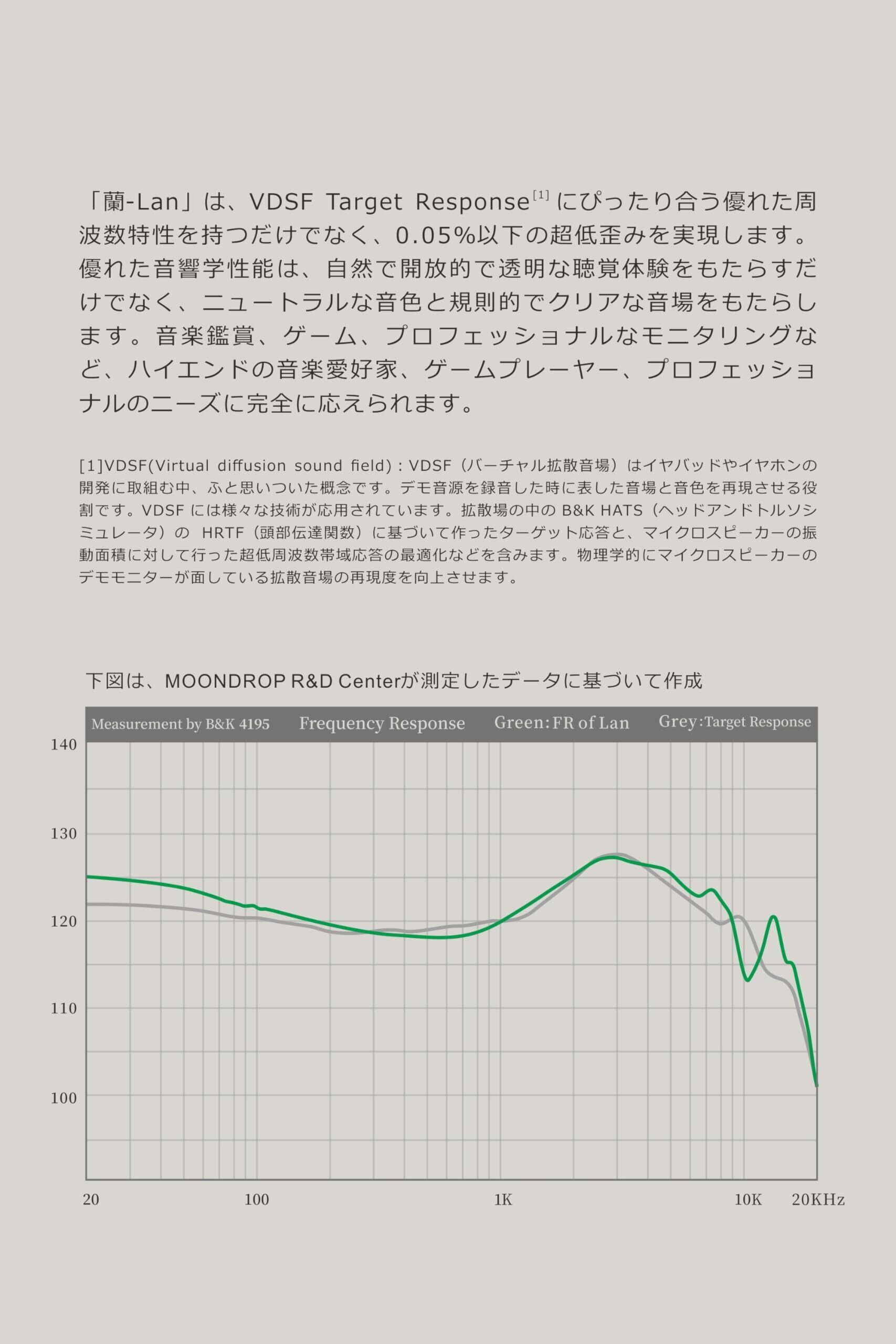 【優れた音響学性能】「蘭-Lan」は、VDSF Target Response にぴったり合う優れた周波数特性を持つだけでなく、0.05%以下の超低歪みを実現します。優れた音響学性能は、自然で開放的で透明な聴覚体験をもたらすだけでなく、ニュートラルな音色と規則的でクリアな音場をもたらします。