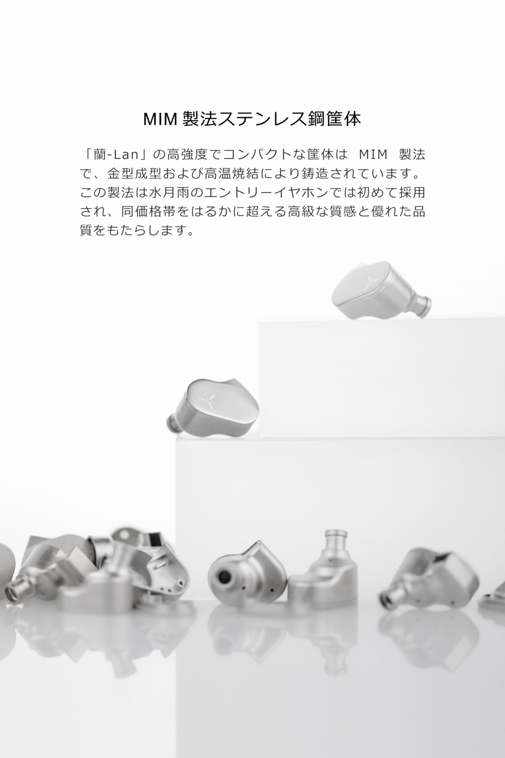 【MIM 製法ステンレス鋼筐体】高強度でコンパクトな筐体は MIM 製法で、金型成型および高温焼結により鋳造されています。この製法は水月雨のエントリーイヤホンでは初めて採用され、同価格帯をはるかに超える高級な質感と優れた品質をもたらします。