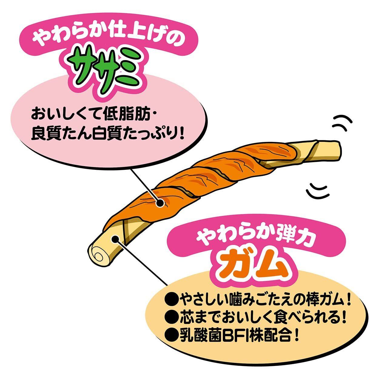低脂肪・良質たん白質豊富なササミをやわらかく仕上げて、芯までおいしく食べられるやわらか弾力ガムに巻きました。シニア犬や小型犬、硬いものが苦手なワンちゃんにもオススメ!着色料不使用。農林水産省認定 鳥加熱処理工場製造。