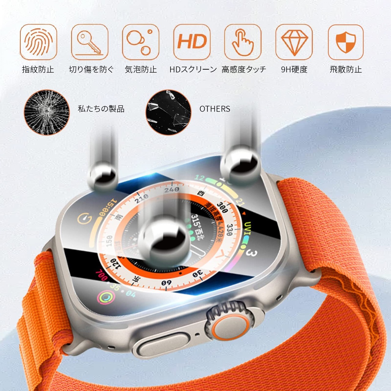 高品質素材: Apple Watch フィルムは日本製旭硝子フィルムのPET複合材 。本製品は100000回以上もテストされており、摩擦および衝撃による損傷はなく、スマートウォッチ本来の美しさをそのままに保つことが可能です。