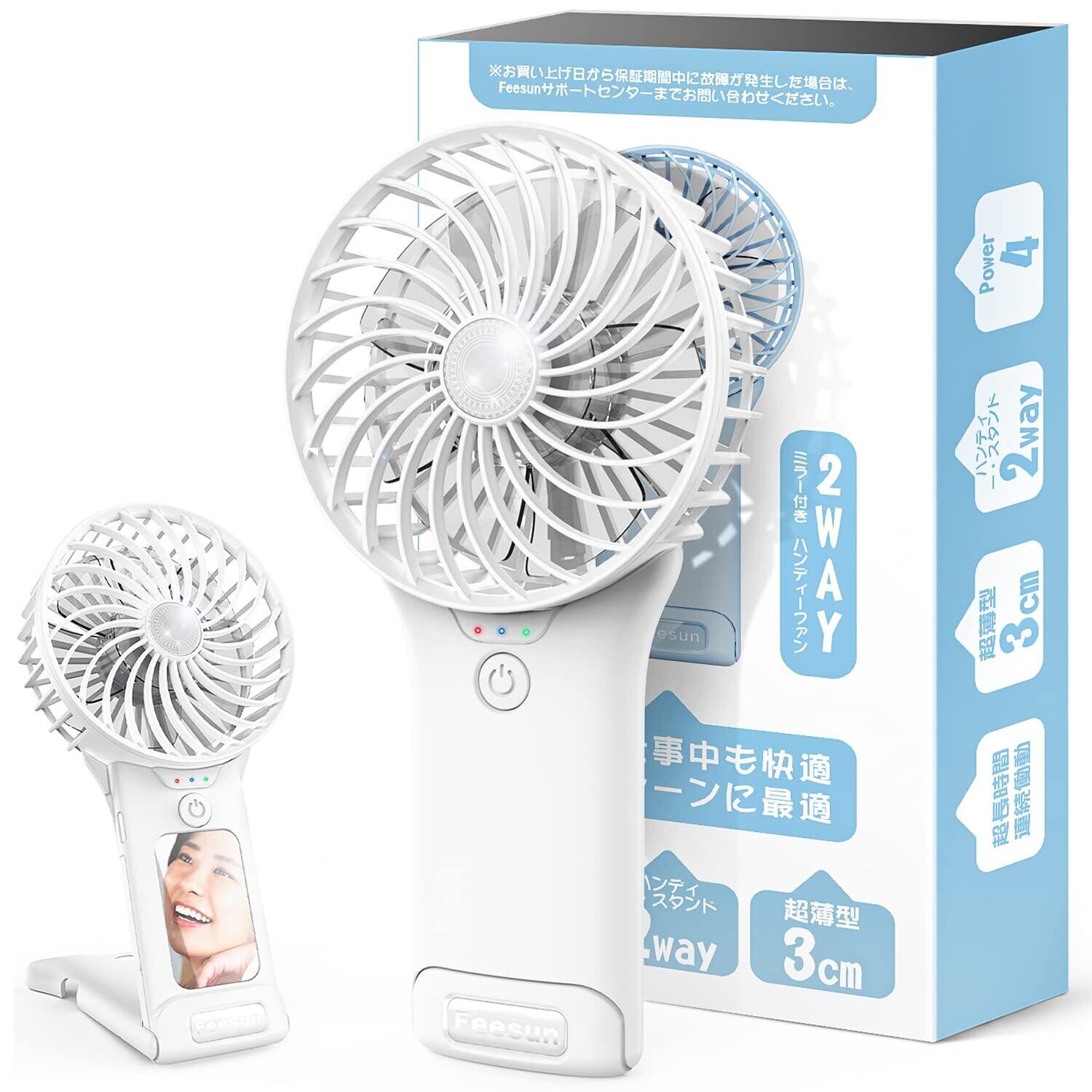 Feesun ハンディファン 手持ち扇風機 卓上 携帯扇風機 ミラー付き 小型 静音 DCモーター Type-C充電式 ミニ扇風機 強風 熱中症対策 折り畳み式 強風 弱でも涼しい 4段階風量 10dB静音 ホワイト