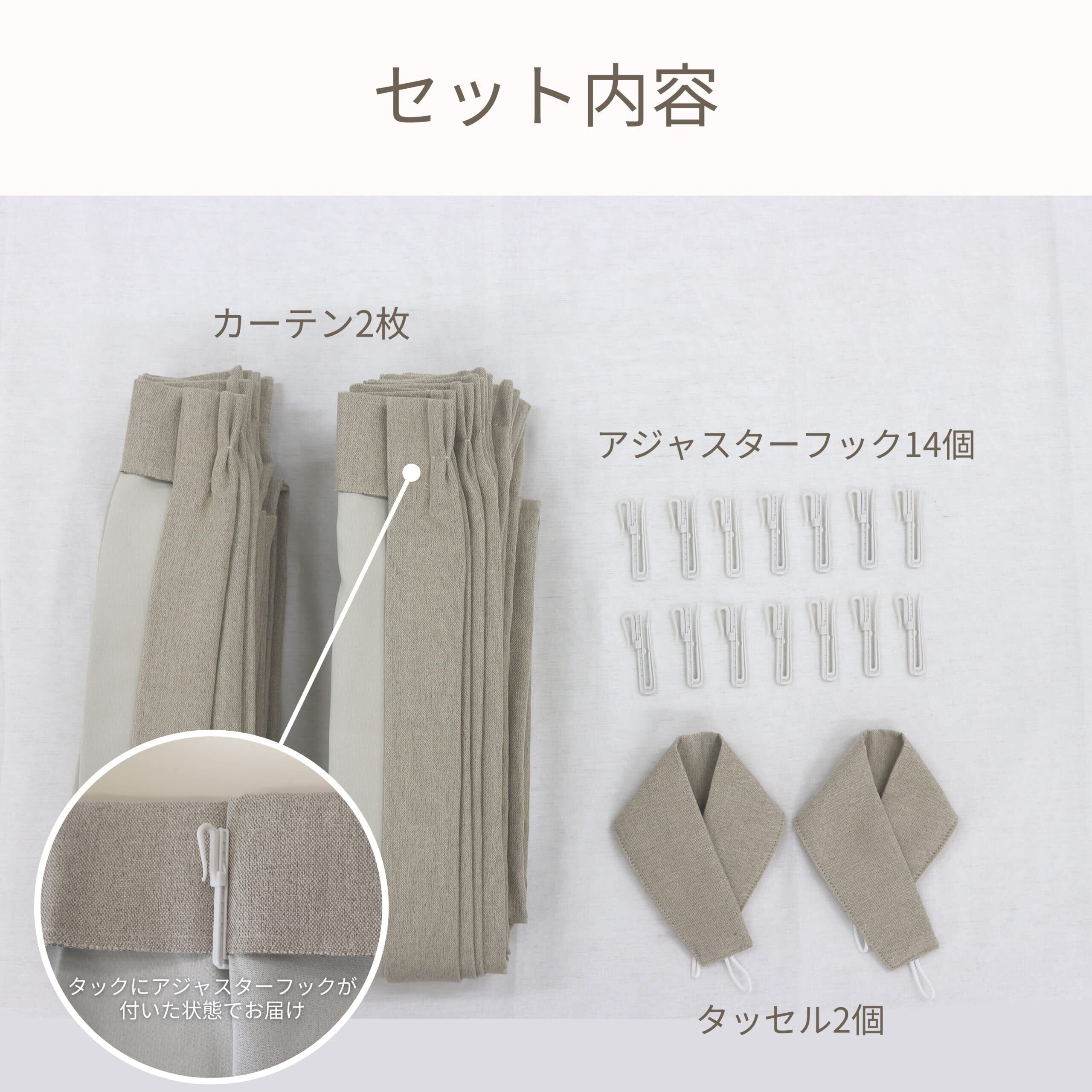 セット内容はカーテン2枚・タッセル2本・アジャスターフック14個(カーテンについた状態での発送となります)。