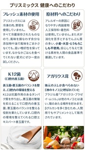 お口の状態を整えてくれる 口腔内善玉菌K12を配合、さらにアガリクス茸・乳酸菌 EF2001・グルコサミン・コンドロイチンがプラスされています。チキンを主原材としたドッグフードです。ブリスミックスには冷凍の肉、野菜を使用していません。ブリスミックスは、アレルギーの原因になりやすい肉副産物・人工保存料・着色料は使用していません。犬が消化を苦手とするでんぷん質の多い、小麦・大豆・とうもろこしも不使用。愛犬に安心して与えて頂ける素材を人間の食品基準で厳選しています。