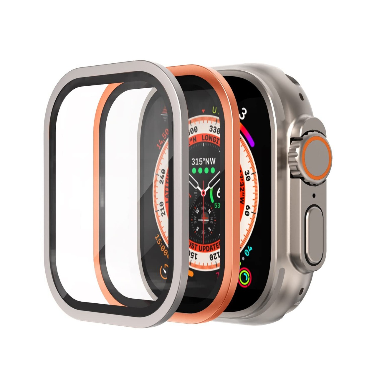 【2枚】アップルウォッチ Ultra 49mm保護フィルム【 アルミ枠 バンパー & ガラスフィルム 一体型 】 49mm専用ケース 全面保護 Apple Watch ultra 強化ガラス 保護 アップルウォッチ iWatch 液晶保護フィルム エッジバンパーカバー, キズ防止 高透過率 貼り付け簡単 指紋防止(オレンジ+チタン色)