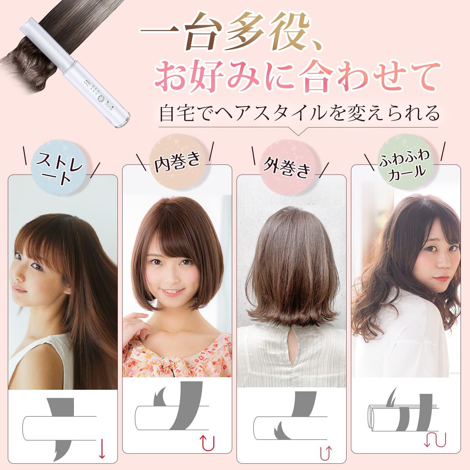ヘアアイロン コードレス ストレート ミニ ヘアアイロン 2way カール&ストレート 3段階温度設定可能 ワイヤレス 前髪 軽量 日本語説明書付き(ホワイト)