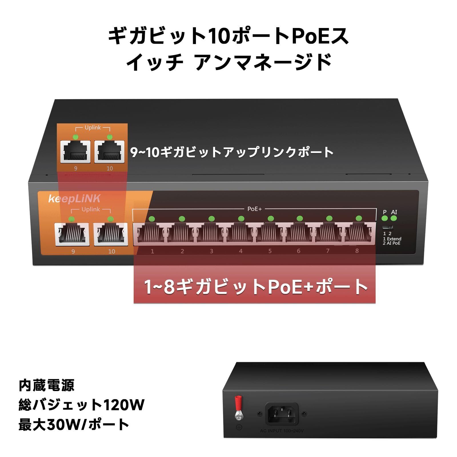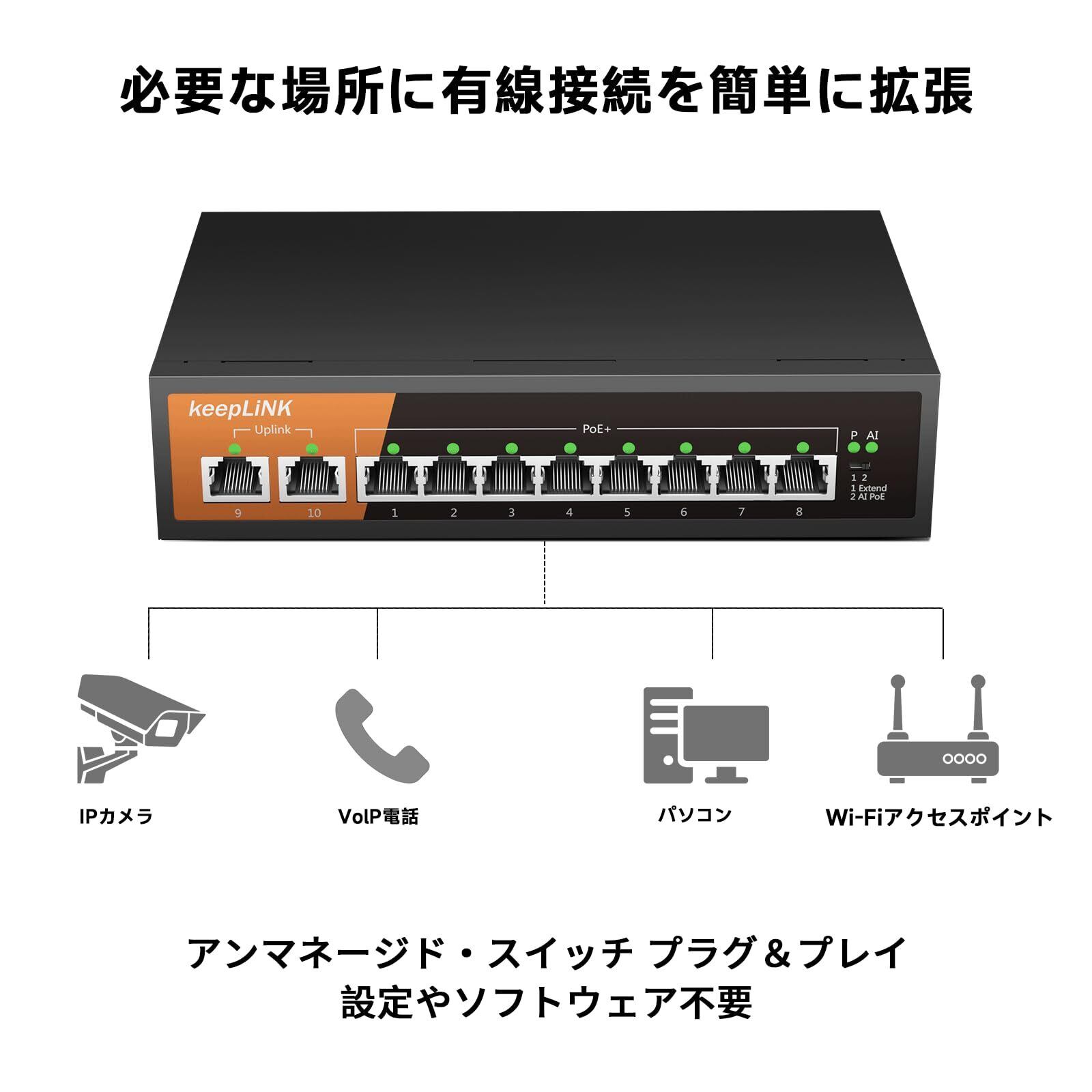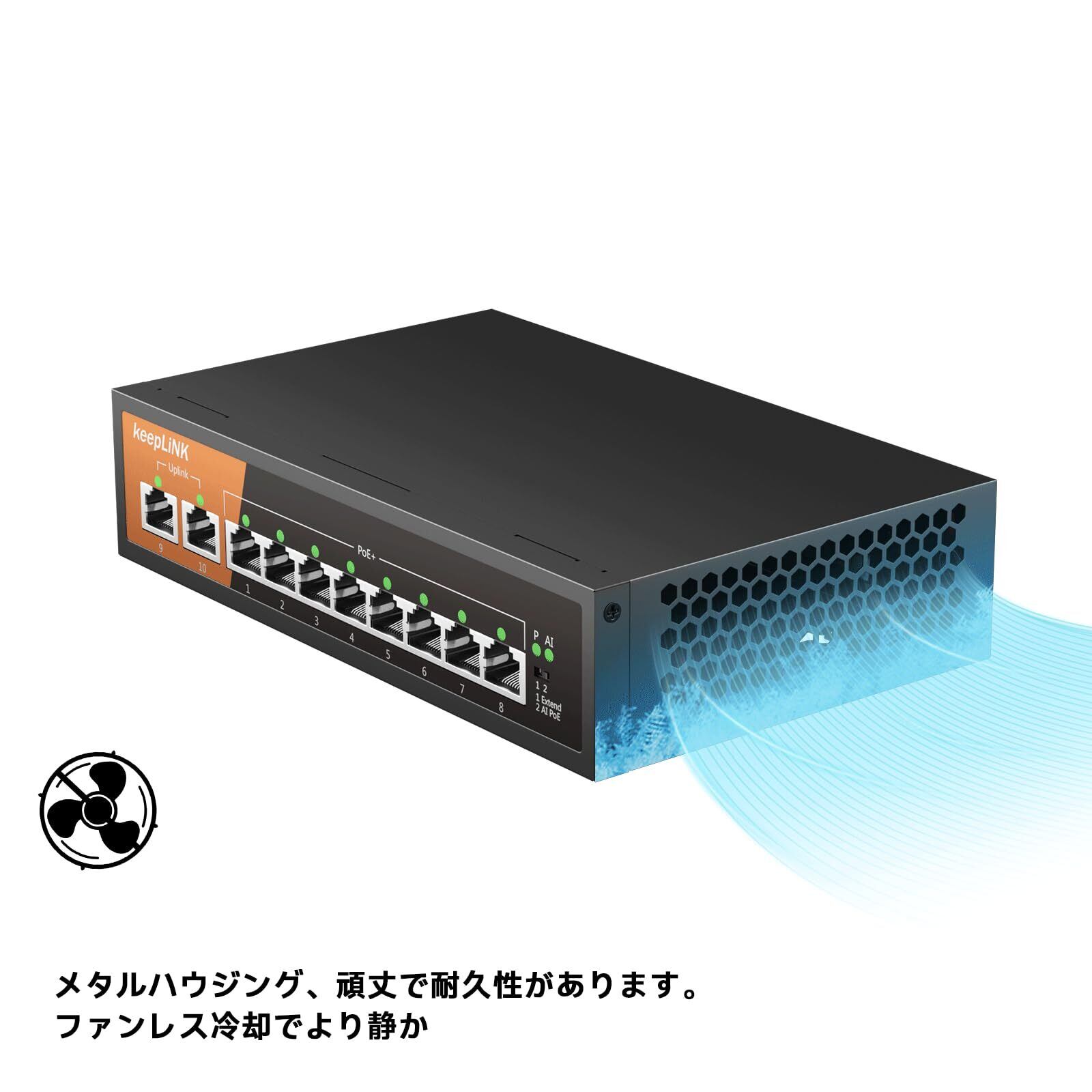 keepLiNK スイッチングハブ ギガビット 10ポート (PoE 8ポート 135W) 金属筐体 電源内蔵 ブラック 簡易パッケージ