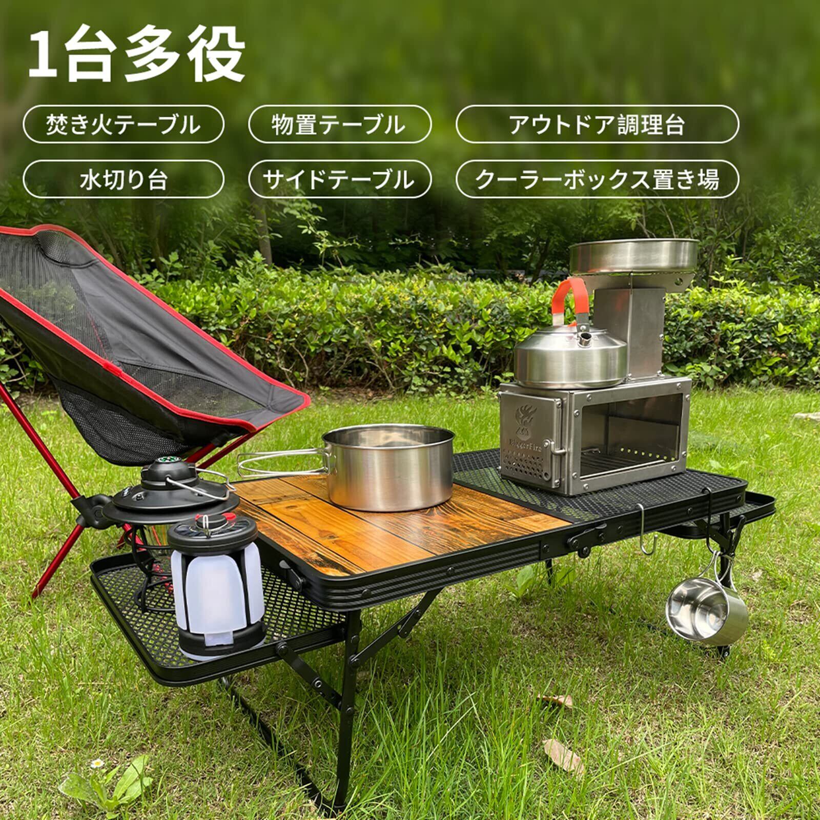 UPF キャンプ テーブル メッシュ サイドテーブル付き アウトドア テーブル 木目 軽量 折りたたみテーブル コンパクト ローテーブル 折り畳み 耐熱 焚き火テーブル BBQ 登山 ミニ アルミ製 てーぶる フィールドホッパー キャンプ用品 ソロ 収納袋付き 携帯便利 おしゃれ (木目 Plus)