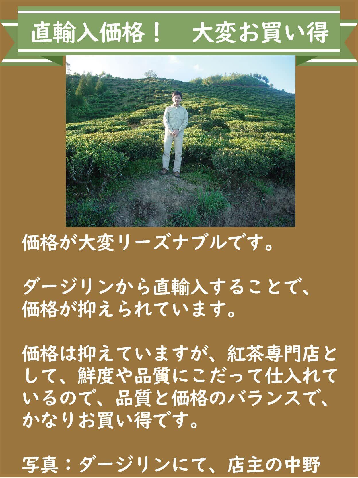 ●直輸入価格 ■価格が大変リーズナブルです。 ■ダージリンから直輸入することで、 価格が抑えられています。 ■価格は抑えていますが、紅茶専門店と して、鮮度や品質にこだって仕入れて いるので、品質と価格のバランスで、 かなりお買い得です。