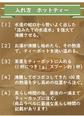 ■ホットティーのレシピ:(1)水道の蛇口から勢いよく出した「汲みたての水道水」を強火で強く沸騰させる。 (2)お湯が沸騰し始めたら、その熱湯でティーポットを素早く洗いながして温める。 (3)茶葉をポットに入れて、沸騰してボコボコしてきた熱湯(100度)を注ぐ。 (4)時間が経ったら、最後の一滴までティーカップに注ぐ。 *最適な蒸らし時間は紅茶ごとに異なるので、お届けする商品ラベルに記載してます。