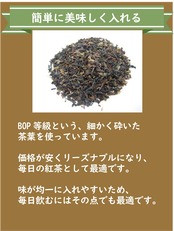 ●簡単に美味しく入れる ■BOP等級という、細かく砕いた 茶葉を使っています。 ■価格が安くリーズナブルになり、 毎日の紅茶として最適です。 ■味が均一に入れやすいため、 毎日飲むにはその点でも最適。