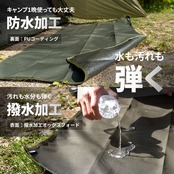 【防水これ1枚でOK】●裏面:キャンプで一晩使っても染みません。ポリウレタンコーティングが地面からの湿気を抑え、裏はびっしょり濡れても表はサラサラをキープ。泥がついても水をかければツルンと簡単に落ちるのでお手入れ簡単です。●表面:撥水性があり、水や汚れをポロポロ弾きます。濡れにくいためシートが水を吸って重くなることも防げます。