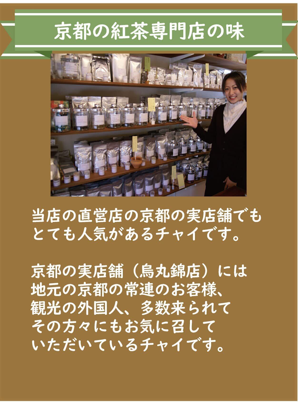 ●京都の紅茶専門店の味● 当店の直営店の京都の実店舗でも とても人気があるチャイです。 ぜひ、ご自宅で、この味をご堪能 くださいませ。
