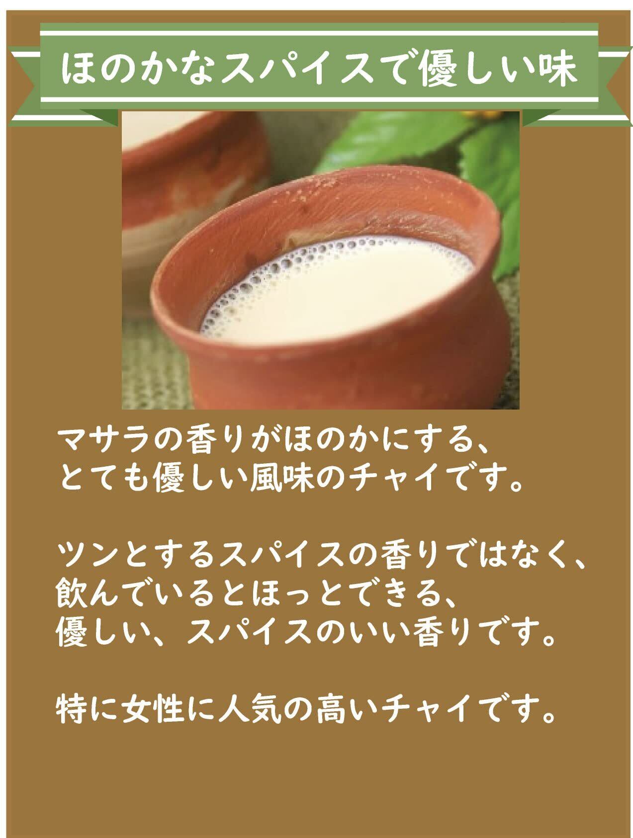 ●ほのかなスパイスで優しい味● マサラの香りがほのかにする、 とても優しい風味のチャイです。 ツンとするスパイスの香りではなく、 飲んでいるとほっとできる、 優しい、スパイスのいい香りです。 特に女性に人気の高いチャイです。
