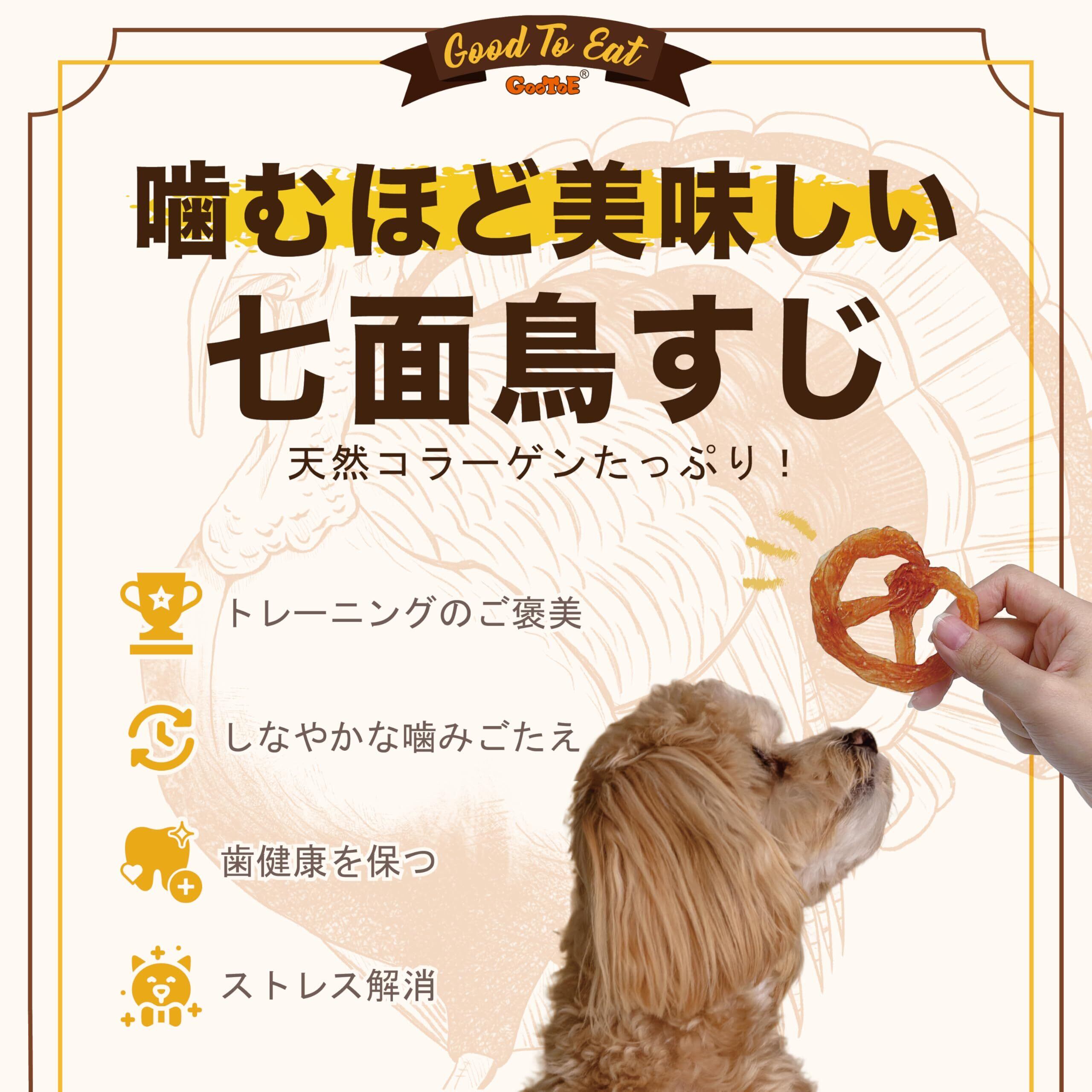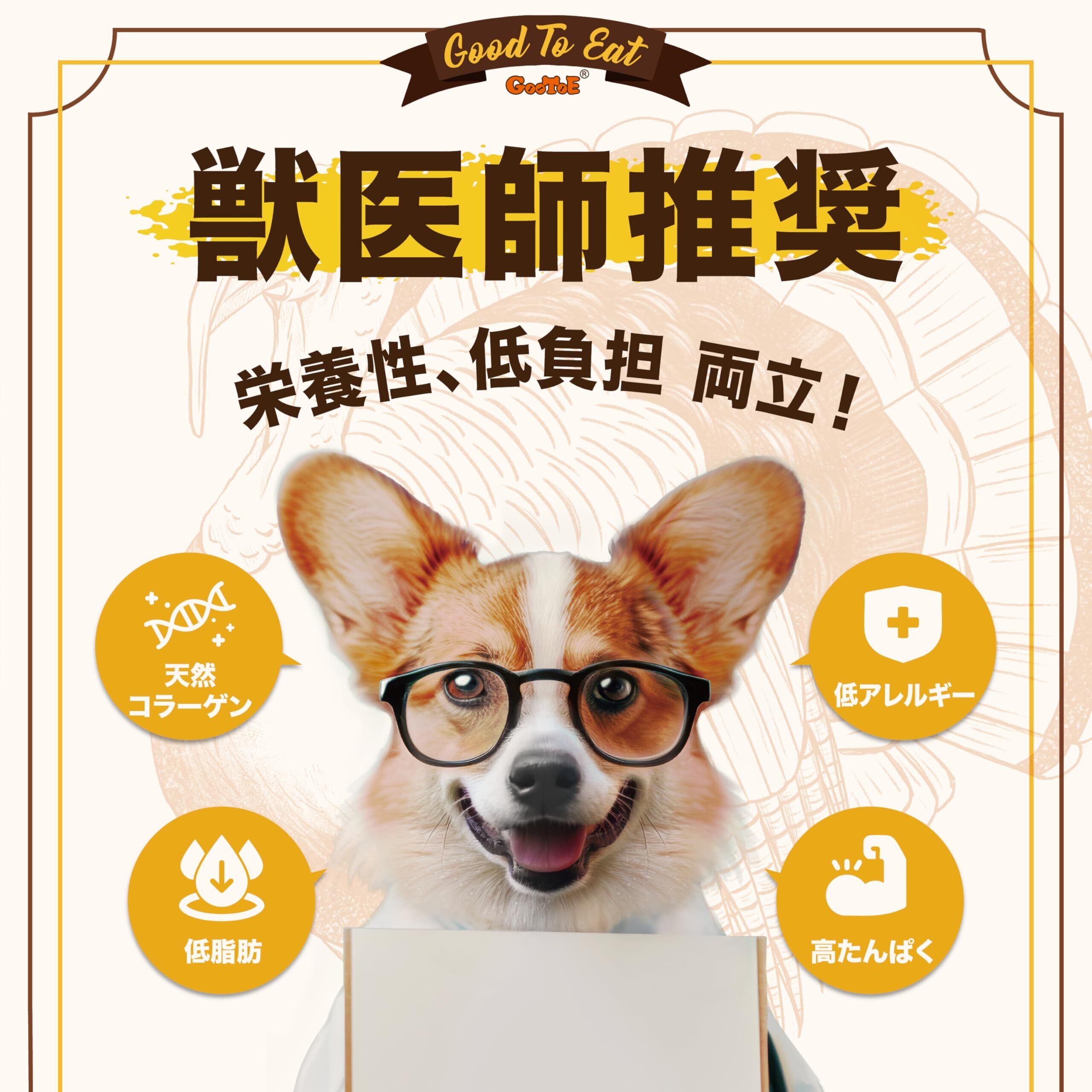 【天然素材、無添加】100%アメリカ産の七面鳥すじを使用。人工のフレーバー、色素、保存料を一切使用せず、高タンパク質、低アレルゲン、低脂肪、低カロリーを実現した犬用おやつ、愛犬の健康を支えます。