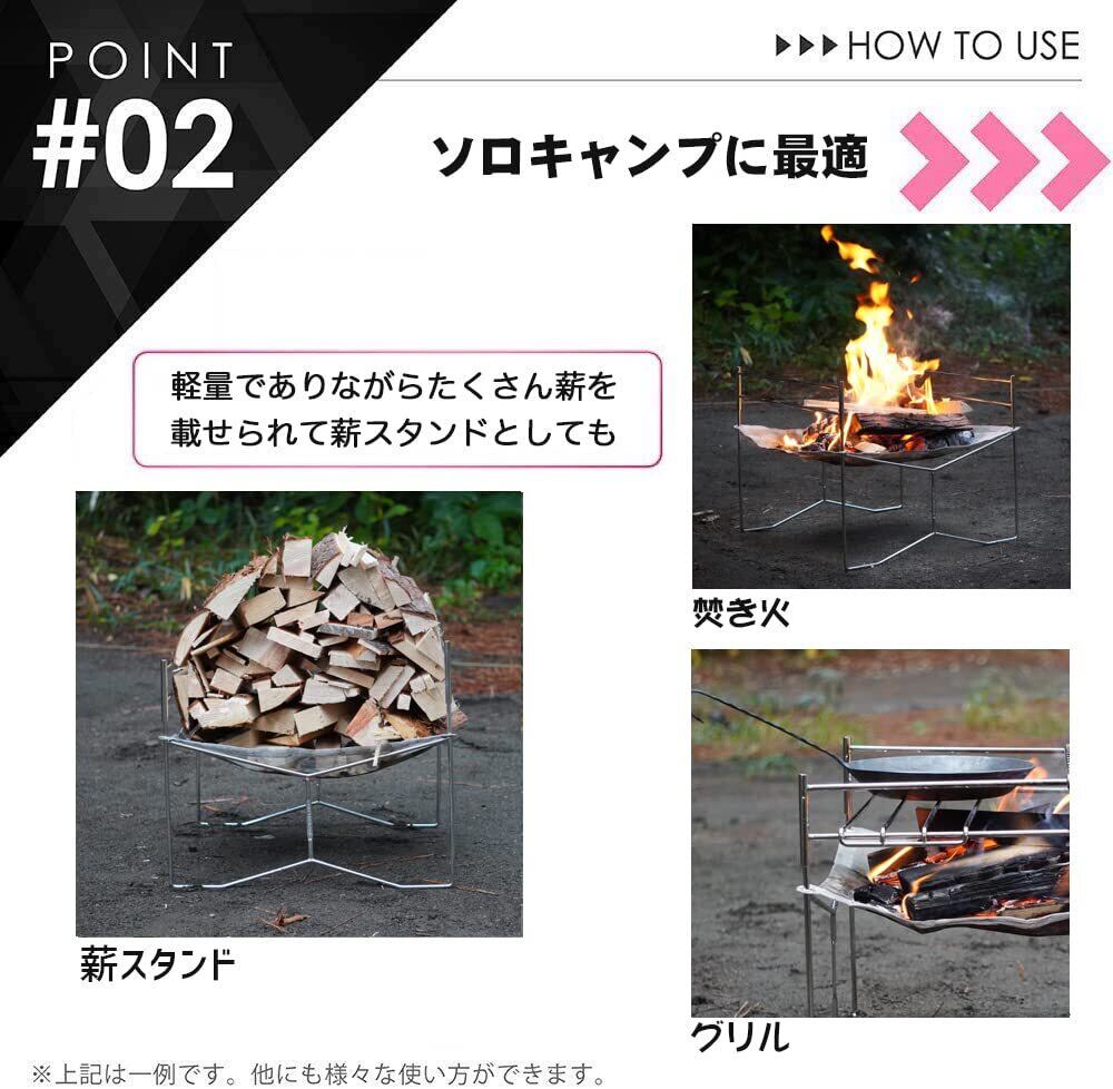 特徴:▶高さ2パータン調整可能。火力に合せに合わせて高さを変えることができるので非常に便利です。 ▶広げて差し込むだけ!超簡単焚火台。▶薄くコンパクトな収納が可能。▶ステンレスメッシュが傷んで来れば、取り換える事ができます。