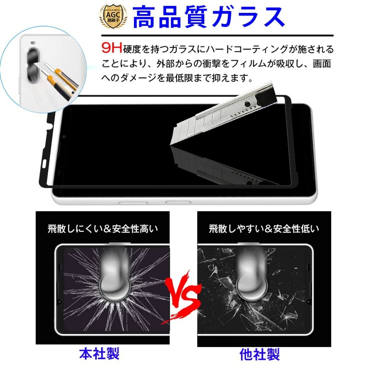 【高品質ガラス】日本旭硝子製ガラス素材を使用しており、9Hの表面硬度を誇る保護フィルムです。通常のPETフィルムより4倍の強度、鍵やカッターなどの鋭利な物を当てても損傷なく使用する事が可能で、摩擦や傷から液晶ガラスをしっかり保護します。万が一強力な衝撃でガラスフィルムが割れてしまっても、破片の飛び散りを防ぐ飛散防止コート処理で、画面をしっかり保護、スマホ本体と共に手の怪我の心配もありません。二重の保護で日常生活では、スマホを落としたり衝撃を受けたりした時に、保護フィルムがあれば、画面やレンズの破損を気にすることなく、しっかりと保護することができます。