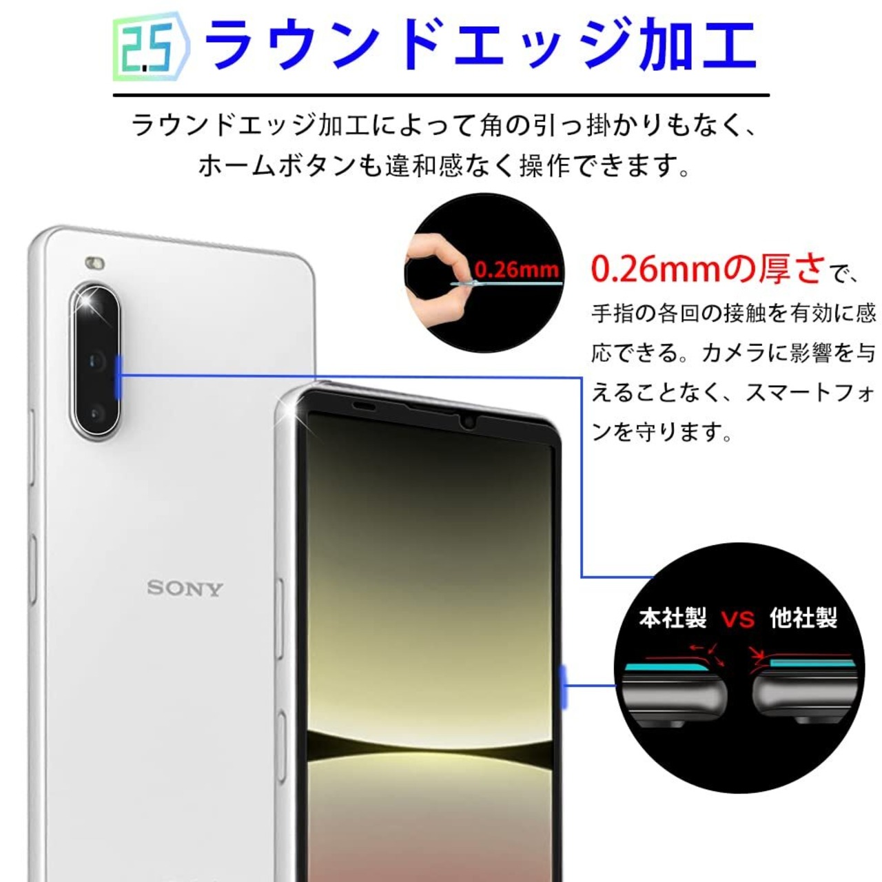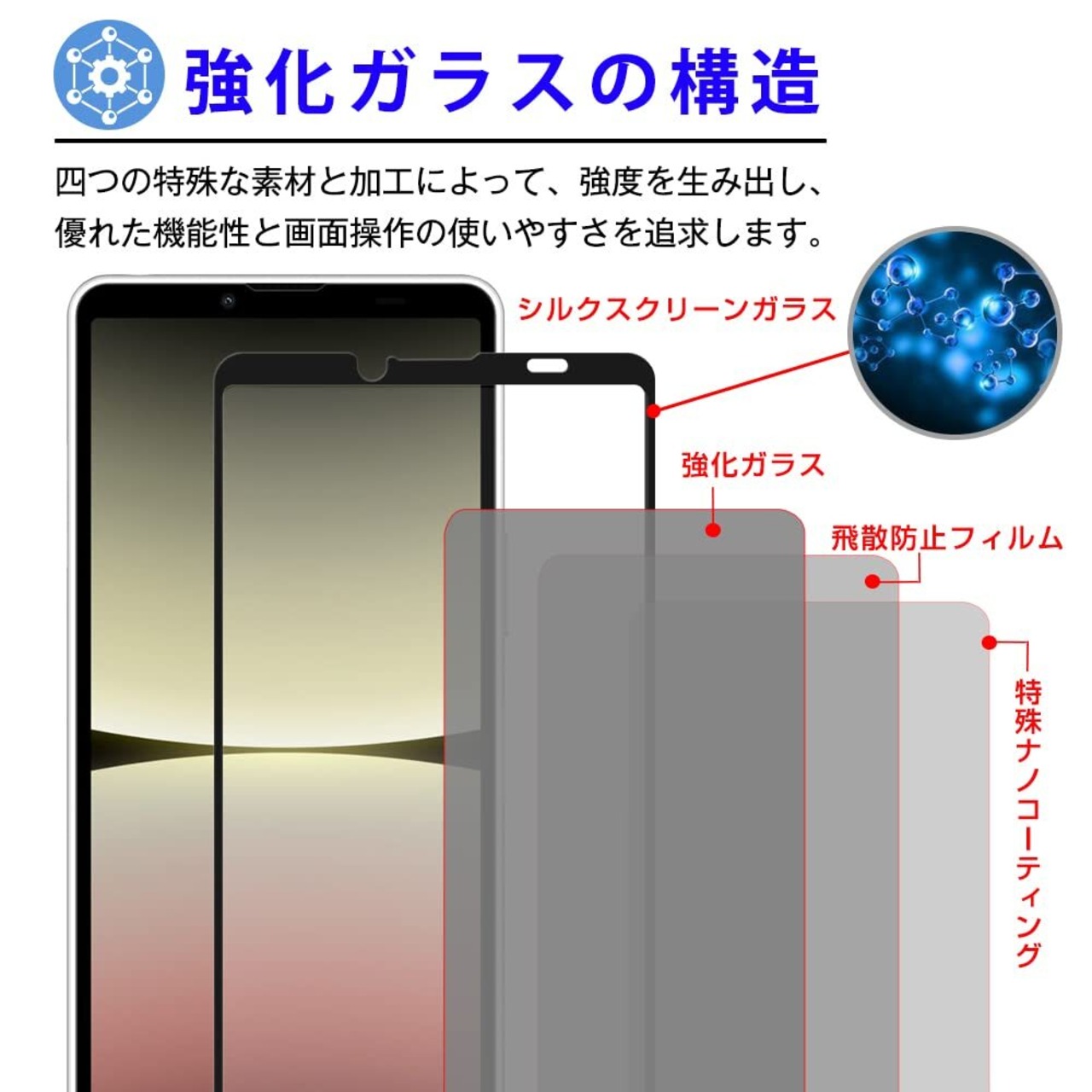 【貼付け簡単ガラス】 Xperia10 V フィルム接着面に吸着に優れたシリコンコーティングを施しているので、シリコン自己吸着層をもっており位置を合わせて置くだけで気泡なしで貼れ、フィルム貼りが苦手という方でも簡単に貼る事が可能です。薄くて軽いデザインで、まるで携帯自体だけを持っているような感じです。【2.5Dラウンドエッジ加工&ケースとの相性も良し】当製品のフィルム はスマホの形状を考慮し、全面をフルカバーするのに最適な【 2.5Dラウンドエッジ 】タイプを採用。フィルムの剥がれ、浮き防止、スマホケース装着時の干渉を防ぐため、液晶とフレームの境目に適当なスペースを残すデザインとなっています。この特別なデザインによって縁にかかる衝撃を吸収して、リスクを軽減することもできます。スマホ本体との一体感を産み出し、ケースとの干渉の問題をクリアし、様々な形状のケースでも相性良く対応可能となっています。