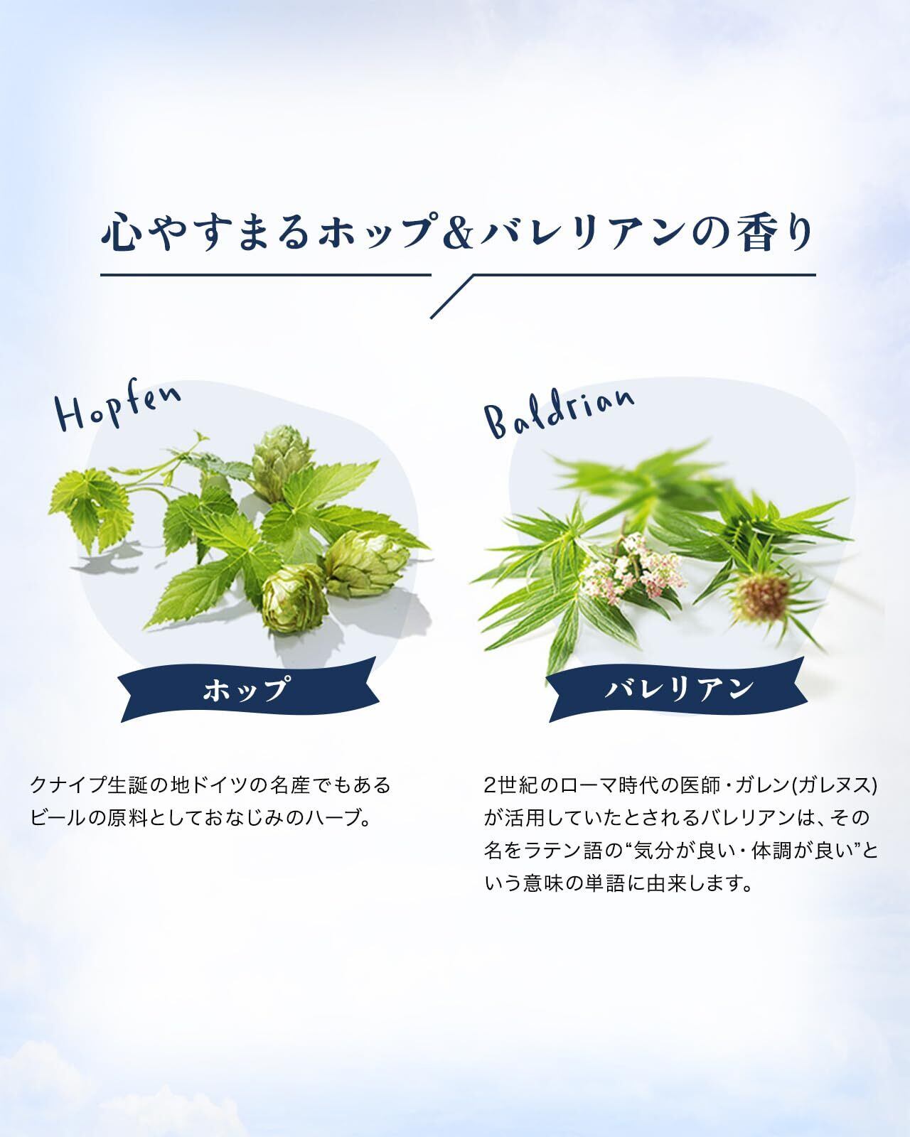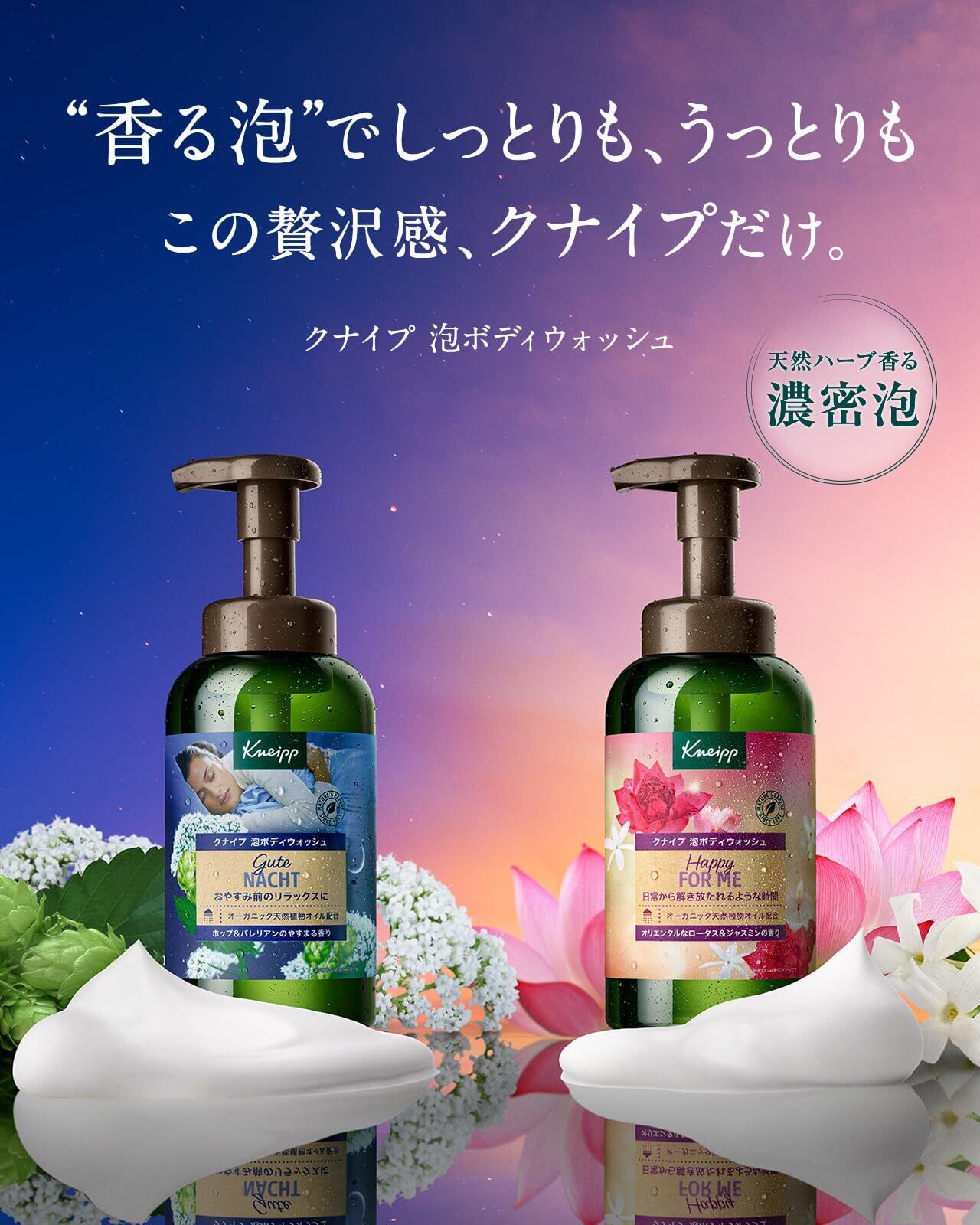 お風呂場を知り尽くしたクナイプからついに誕生した、泡タイプのボディウォッシュ。天然ハーブの本格的な香りと、天然植物成分由来のもちもち濃密泡に包まれて、日常のシャワータイムが“贅沢 なご褒美タイム”になります。3種のオーガニック天然植物保湿成分(アルガンオイル・ホホバオイル・カレンデュラ花エキス)を贅沢に配合し、う るおいベールをまとったようなしっとり肌に洗いあげます。ビーガン対応、防腐剤フリー、合成ポリマーフリー、生分解性が高い成分を使用しており、人にも環境にもやさしい 処方です。敏感肌・乾燥肌にもお使いいただけます。(パッチテスト・スティンギングテスト済)