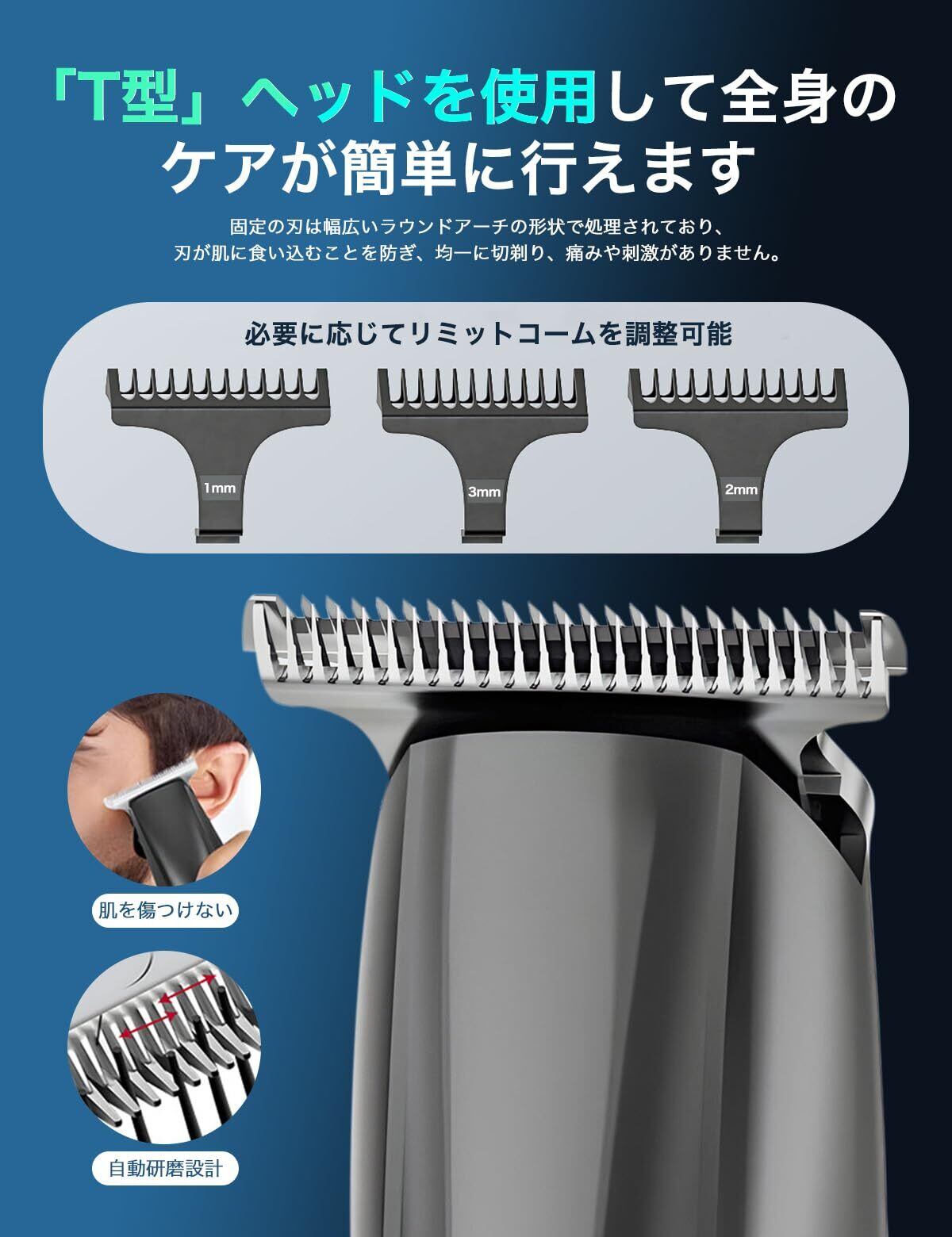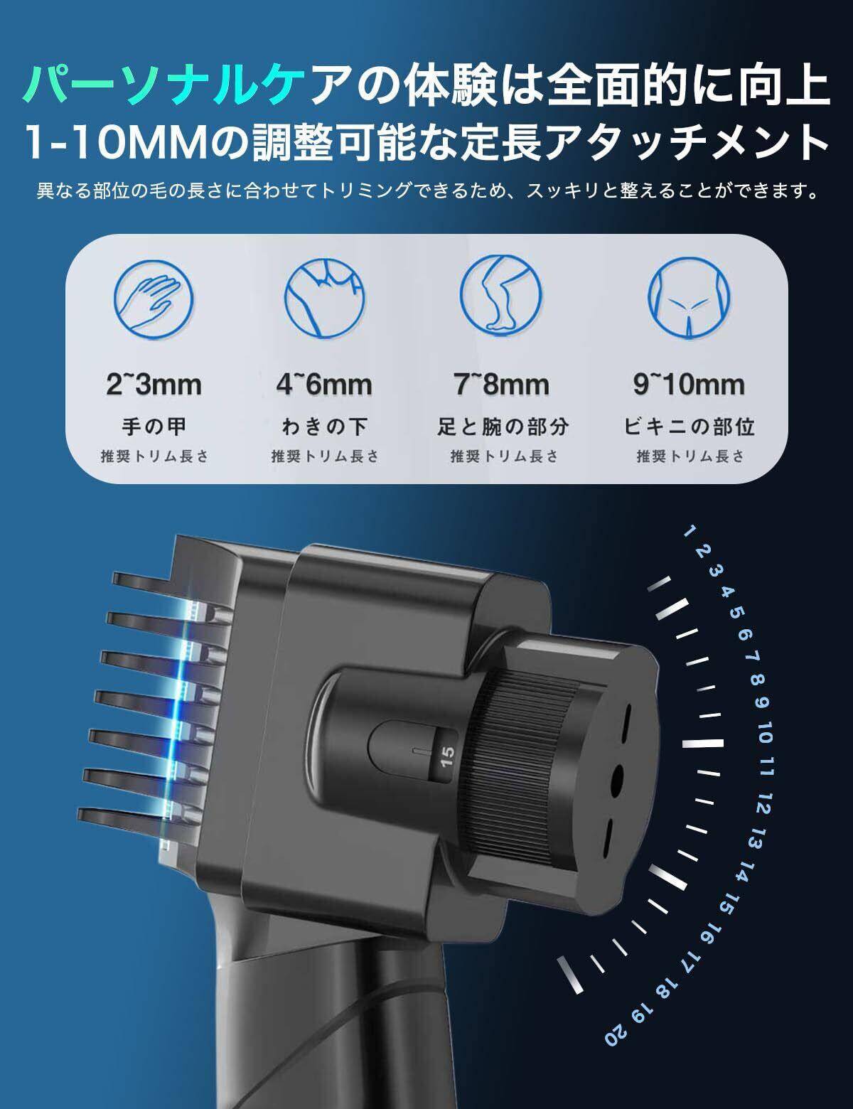 バリカンのアクセサリー: 毎分7200RPM回転する強力なモーターを搭載され、パワフルで切れ味の良いです。特別に設計したトリマーアクセサリーを使用して、トリミングの長さを微調整することができ、体のいろんなエリアの毛を正しくとかすことができます。(トリミングするときに敏感なところに追加の保護を提供して、トリミングの精度をアップしました)。体毛を思い通りにデザインします。長さの調整器(1-10mm)*1、肌保護装置*1(2mm)、3種の長さとヘアカットアクセサリー(1mm、2mm、3mm)を含んでおります。