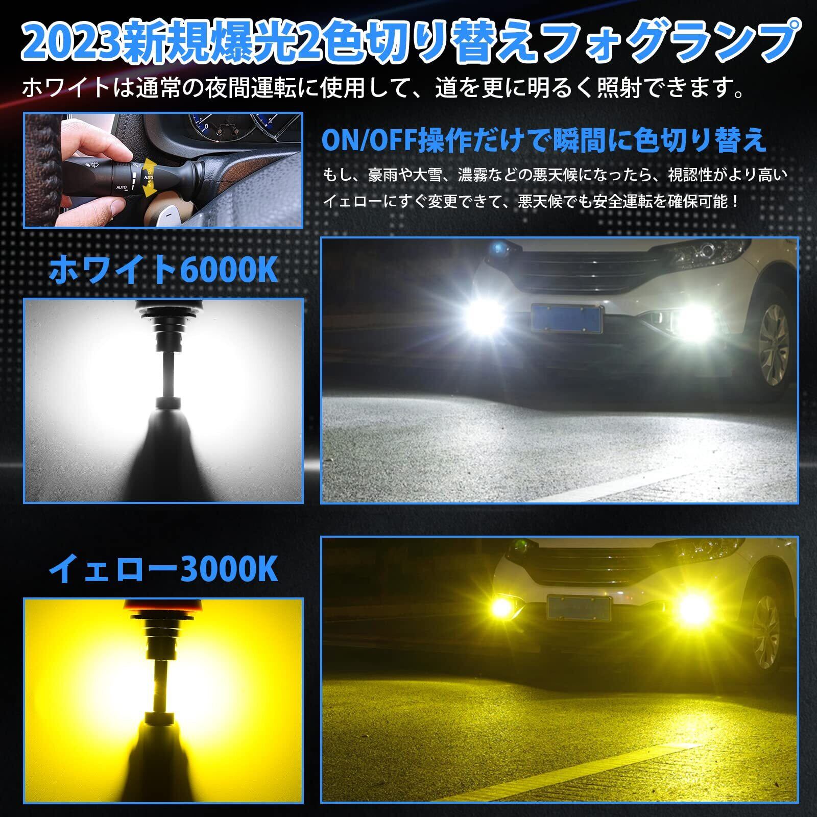 【HB4 LED フォグ 爆光】暗い純正フォグランプにうんざりしたか?LEDを交換して、車検が通らなく、取り付けもめんどくさいなどの不安がありますか? SUPAREE 最新HB4 LED フォグランプ 2色切り替えを試しましょうか。純正の発光点1:1参考し、正確な配光を実現して視認性が従来品やハロゲンより断然にアップ!さらに、スイッチを繰り返すだけでホワイトとイエロー、アイスブルーを切り替えます。6000Kのホワイトは明るさを上がり、夜間運転更に安全、安心になります。3000kのイエローは雨や雪、霧などの悪天候に適して、高い視認性を持ちます。悪天候でも視認性を確保できる。アイスブルーが加えて、日常の使用や撮影用もピッタリで派手な感じ!おしゃれで個性が溢れています。より快適なドライブしましょう!お気軽に色を変えたい方にもおススメです!