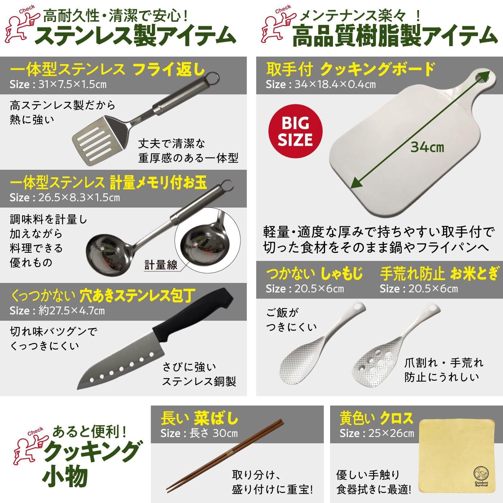【 確かな品質のキャンプ用 調理器具 】全ての調理器具は食品検査済! 重厚感のある高級ステンレス製品&メンテナンスが楽に行える良質な樹脂製品を厳選しました。 キャンプ や バーベキュー 後の片付けも楽チンの調理器具 セットになっています。 もちろん検査基準やクリーン性を全て満たした調理器具 ( キャンプ用品 ) です!