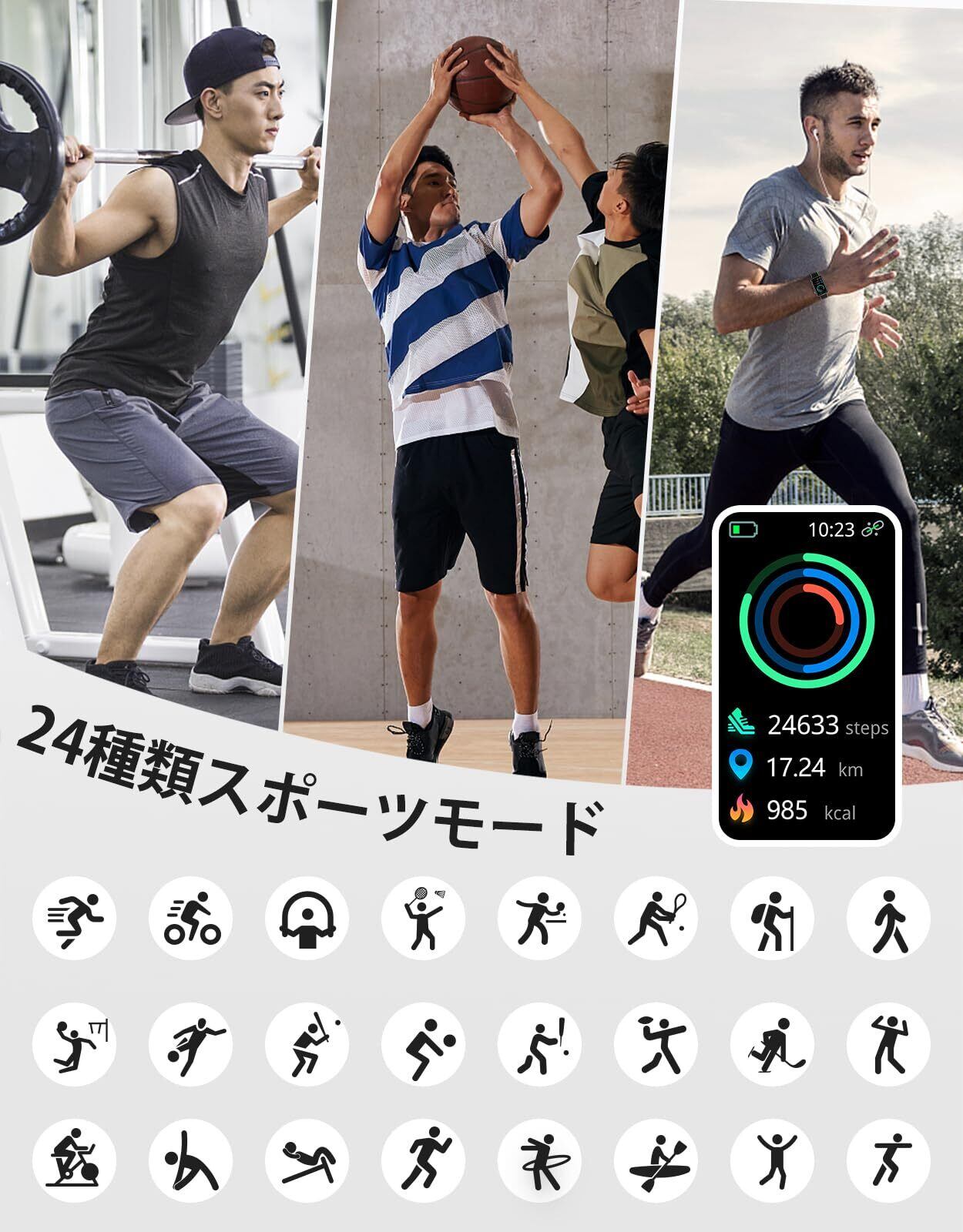「24種類の運動モード·IP68防水」スマートウォッチL2には24種類の運動モードがあります。ランニング、ウォーキング、登山、ヨガなど、あらゆる種類の運動に対応しています。運動中にこのウォッチを身につけて、自分自身のフィットネスレベルを向上させましょう!さらに、このウォッチはIP68の防水機能を備えており、普段は手や顔を洗うときに外す必要はありません。しかし、海水、プール、お風呂、サウナ、温泉などの熱い水中では使用できません。これらの環境下で使用すると、ウォッチが損傷する可能性があります。使用する際には、この点にご注意ください。