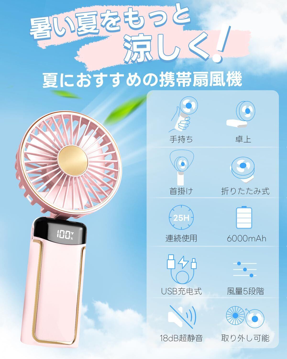 Fomirkle ハンディファン 携帯扇風機 USB卓上扇風機 ハンディ 首掛け 折り畳み 5段階風量調節 18dB静音 6000mAh 作動時