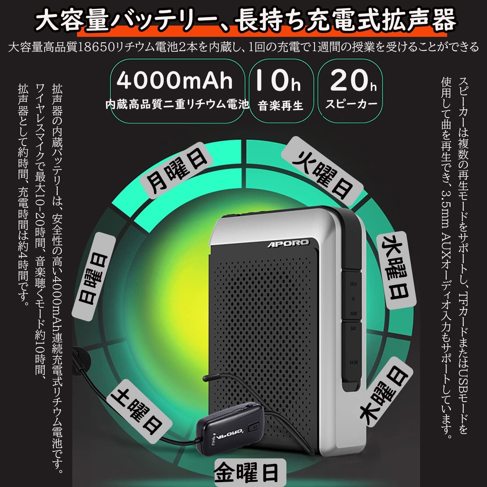 【幅広い用途】拡声器サポートBluetooth5.0、TF Card (micro sd)カード、USBメモリーディスクおよび3.5mm auxオーディオ入力(micポートはauxポートとして使用可能)。ハンズフリーなので、ニーズの異なる室内でも屋外でも使いたい場所へ気軽に持ち出せます。室内では、教室、講義や講演、会議室、ヨガ室、ダンスルーム、ジム、スーパーで販促して使用することができます。屋外のガイド、コーチ、街頭演説、大学応援団、学校行事、体育授業、屋台でもスピーカーが使えます。 店頭販売や学校行事、観光ガイドや屋外での集会、体育授業やスポーツの練習など、あらゆる場面でお使いいただけます。