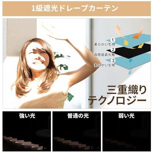 【素材】 ポリエステル100% 柔く滑らかな肌触り無地カーテンは厚い質感があると同時に色も落ち着いて、リビングや寝室など、どの窓辺に掛けてもお部屋の印象を一新させます。特有の三重織りのテクノロジーにより、優れた断熱性が実現できます。夏は強い日差しを遮断し室内温度の上昇を抑え、冬は室外の寒気を遮り、省エネ効果が期待できます。